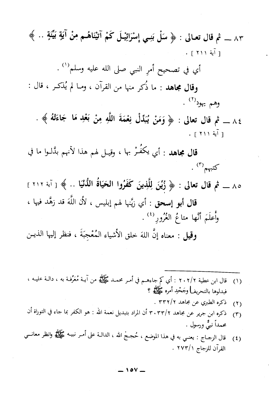 83 - ثم قال تعالى سل بني إسرائيل كم آتيناهم من آية بينة أي في تصحيح أمر النبي صلى الله عليه وسلم وقال مجاهد ما ذكر منها في القرآن وما لم يذكر قال وهم يهود 84 - ثم قال تعالى ومن يبدل نعمة الله من بعد ما جاءته قال مجاهد أي يفكر بها وقيل لهم هذا لأنهم بدلوا ما في كتبهم 85 - ثم قال تعالى زين للذين كفروا الحياة الدنيا قال أبو اسحق أي زينها لهم إبليس لان الله قد زهد فيها واعلم انها متاع الغرور وقيل معناه أن الله خلق الأشياء المعجبة ولا فنظر إليها الذين