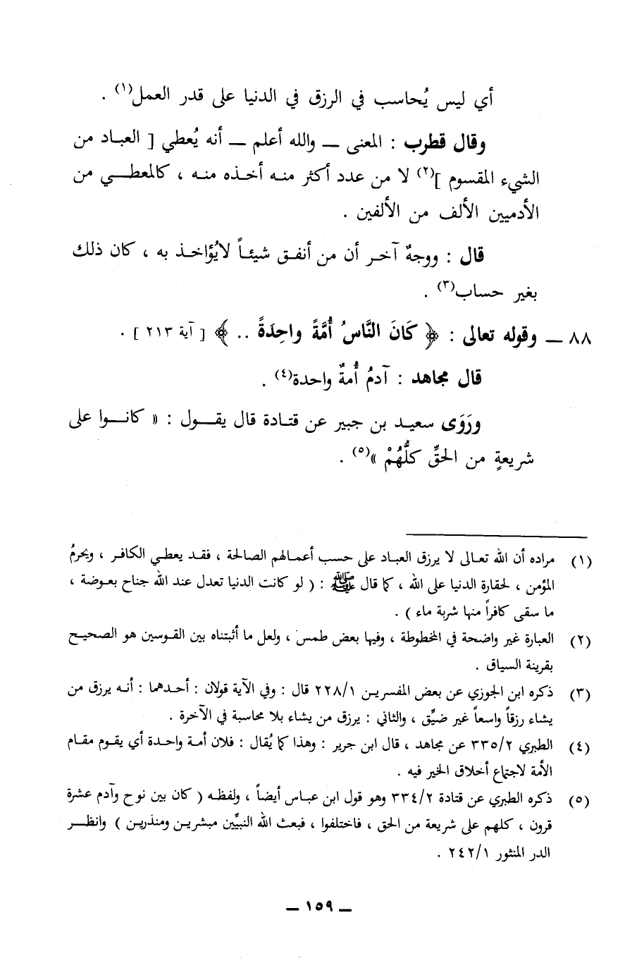 أي ليس يحاسب في الرزق في الدنيا على قدر العمل وقال قطرب المعنى والله اعلم انه يعطي العباد من الشئ المقسوم لا من عدد اكثر منه اخذه منه كالمعطي من الآدميين الالف من الألفين قال ووجه آخر أن من انفق سيئا لا يؤاخذ به كان ذلك بغير حساب 88 - وقوله تعالى كان الناس امة واحدة قال مجاهد آدم امة واحدة وروى سعيد بن جبير عن قتادة قال يقول كانوا على شريعة من الحق كلهم