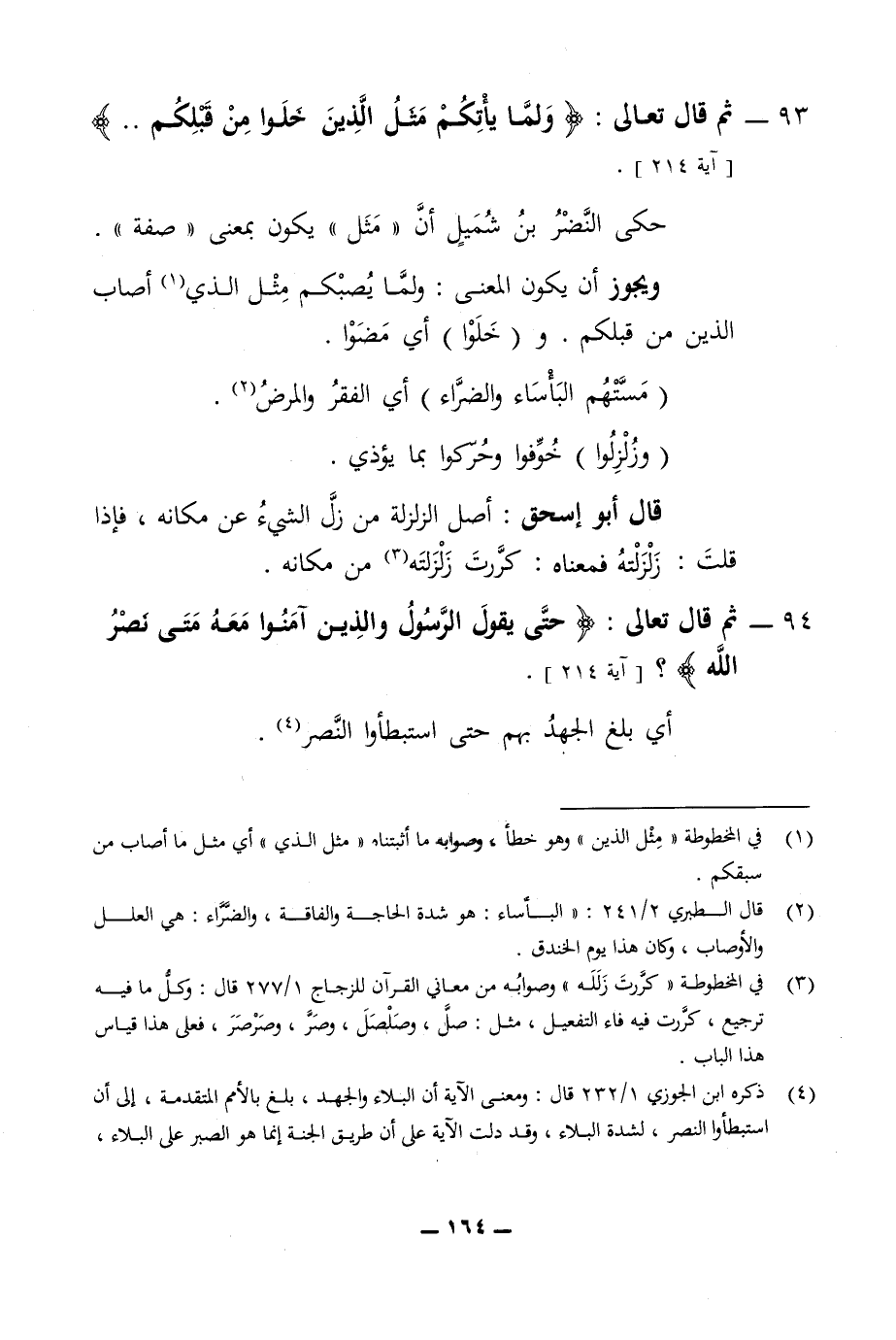 93 - ثم قال تعالى ولما يأتكم مثل الذين خلوا من قبلكم حكى النضر بن شميل ان مثل يكون بمعنى صفه ويجوز ان يكون المعنى ولما يصبكم مثل الذي أصاب الذين من قبلكم وخلوا أي مضوا مستهم البأساء والضراء أي الفقر والمرض وزلزلوا خوفوا وحركوا بما يؤذي قال أبو اسحق اصل الزلزلة من زل الشئ عن مكانه فإذا قلت زلزلته فمعناه كررت زلزلته من مكانه 94 - ثم قال تعالى حتى يقول الرسول والذين آمنوا معه متى نصر الله أبي بلع يبلغ الجهد بهم حتى استبطاوا لم النصر