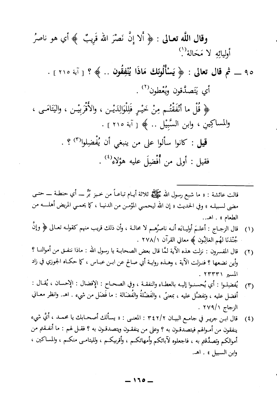 وقال تعالى الا أن نصر الله فريب أي هو ناصر أوليائه لا محالة 95 - ثم قال تعالى يسألونك ماذا ينفقون أي يتصدقون ويعطون قل ما أنفقتم من خير فللوالدين والاقربين واليتامى والمساكين وابن السبيل قيل كانوا سألوا على من ينبغي أن يفضلوا فقيل أولى من أفضل عليه هؤلاء