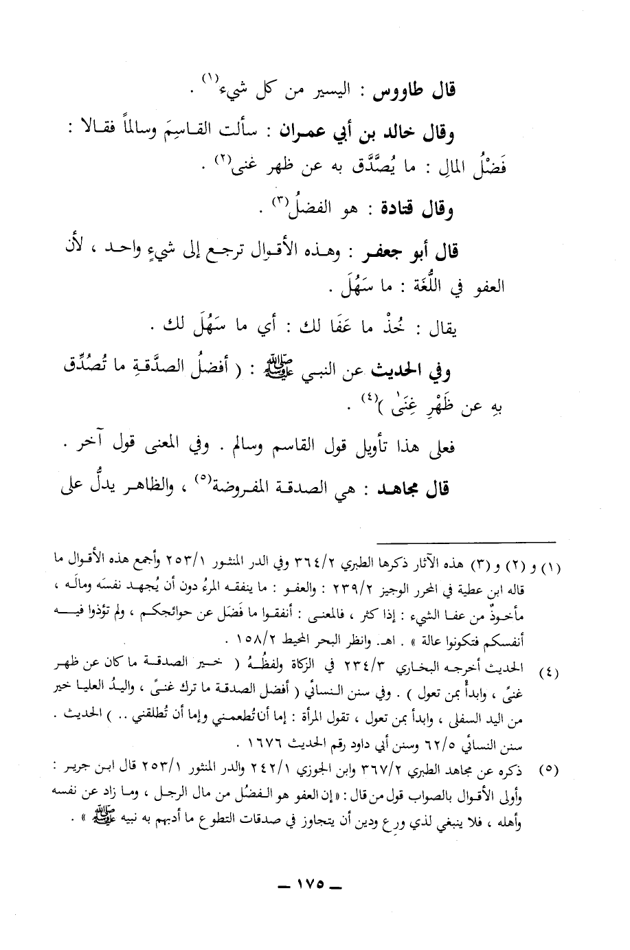 قال طاووس اليسير من كل شئ وقال خالد بن ابي عمران سالت القاسم وسالما فقالا فضل المال ما يصدق به عن ظهر غنى وقال قتادة هو الفضل قال أبو جعفر وهذه الأقوال ترجع الى شئ واحد لان العفو في اللغة ما سهل يقال خذ ما عفا لك صلى الله عليه وسلم أي ما سهل لك وفي الحديث عن النبي صلى الله عليه وسلم افضل الصدقة ما تصدق