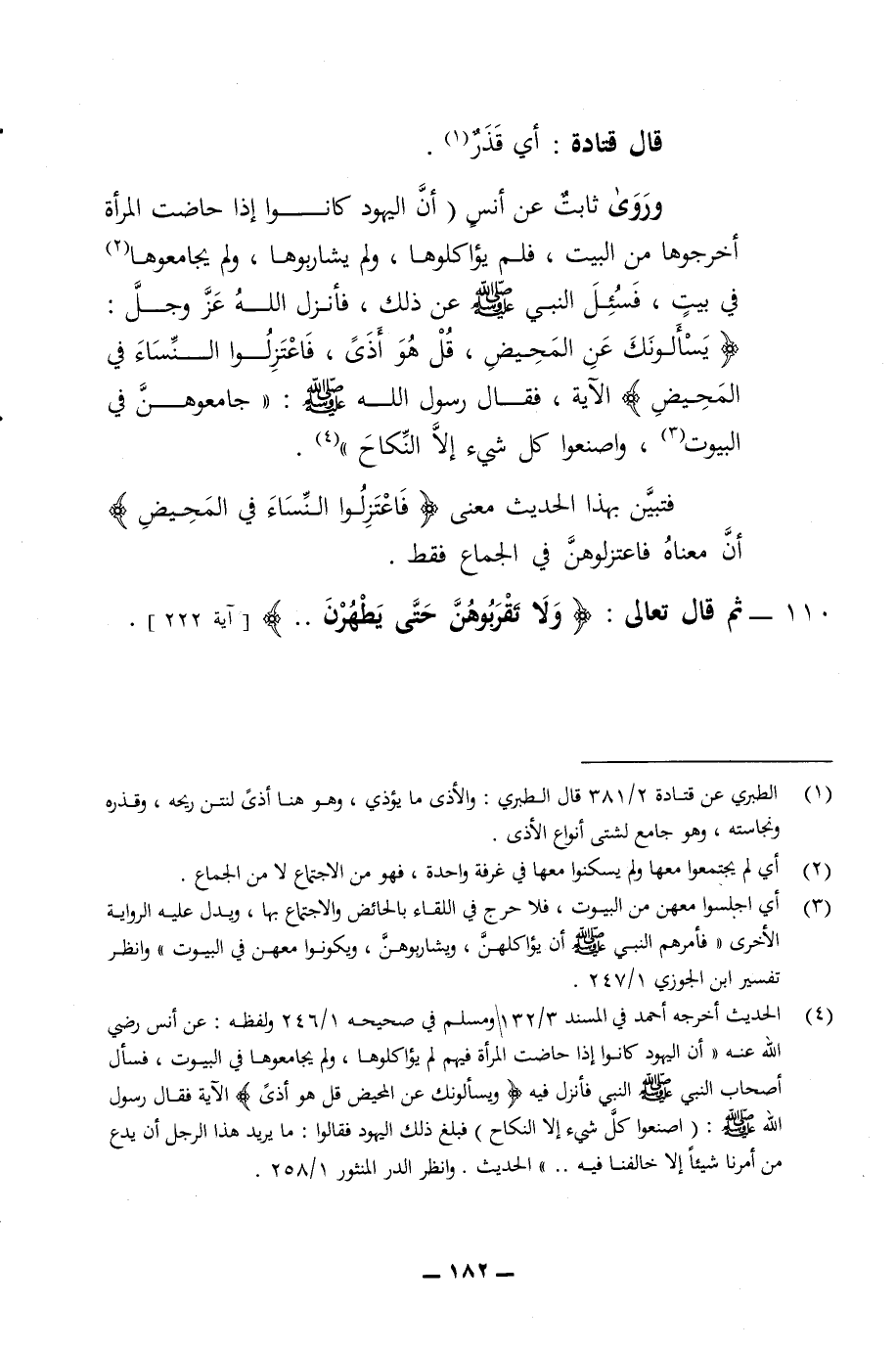 قال قتاده أي قذر وروى ثابت عن أنس أن اليهود كانوا إذا حاضت المرأة أخرجوها من البيت فلم يؤكلوها ولم يشاربوها ولم يجامعوها في بيت فسئل النبي صلى الله عليه وسلم عن ذلك فانزل الله عز وجل يسلونك له عن المحيض قل هو أذى فاعتزلوا النساء في المحيض الآية فقال رسول الله صلى الله عليه وسلم جامعوهن في البيوت واصنعوا كل شئ الا النكاح فتبين بهذا الحديث معنى فاعتزلوا النساء في المحيض أن معناه فاعتزلوهن في الجماع فقط 110 - ثم قال تعالى ولا تقربوهن حتى يطهرن
