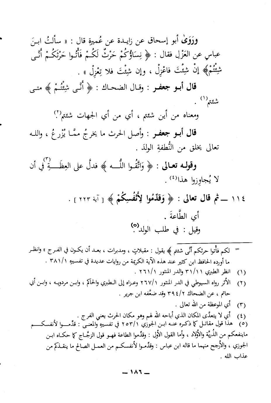 وروى أبو إسحاق عن زايدة عن عميرة قال سالت ابن عباس عن العزل فقال نساؤكم حرث لكم فأتوا حرثكم أنى شئتم ان شئت فاعزل وان شئت فلا تعزل قال أبو جعفر وقال الضحاك أنى شئتم متى شئتم ومعناه من أين شئتم أبي من أبي الجهان شئتم قال أبو جعفر وأصل الحرث ما يخرج مما يزرع والله تعالى يخلق من النطفة الولد وقوله تعالى واتقوا الله فدل على العظة في ان لا يجاوزوا هذا 114 - ثم قال تعالى وقدموا لأنفسكم أي الطاعة وقيل في طلب الولد