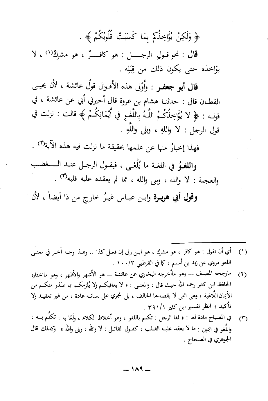 ولكن يؤاخذكم بما كسبت قلوبكم قال نحو الرجل هو كافر هو مشرك لا يؤاخذه حتى يكون ذلك من قبله قال أبو جعفر وأولى هذه الأقوال قول عائشة لان يحيى القطان قال حدثنا هشام بن عروة قال اخبرني ابي عن عائشة في قوله لا يؤاخذكم الله باللغو في أيمانكم قالت نزلت في قول الرجل لا والله وبلى والله فهذا أخبار منها عن عملها بحقيقة ما نزلت فيه هذه الآية واللغو في اللغة ما يلغى فيقول الرجل عند الغضب والعجلة لا والله وبلى والله مما يعقده عليه قلبه وقول ابي هريرة وابن عباس غير خارج من ذا ايضا لان