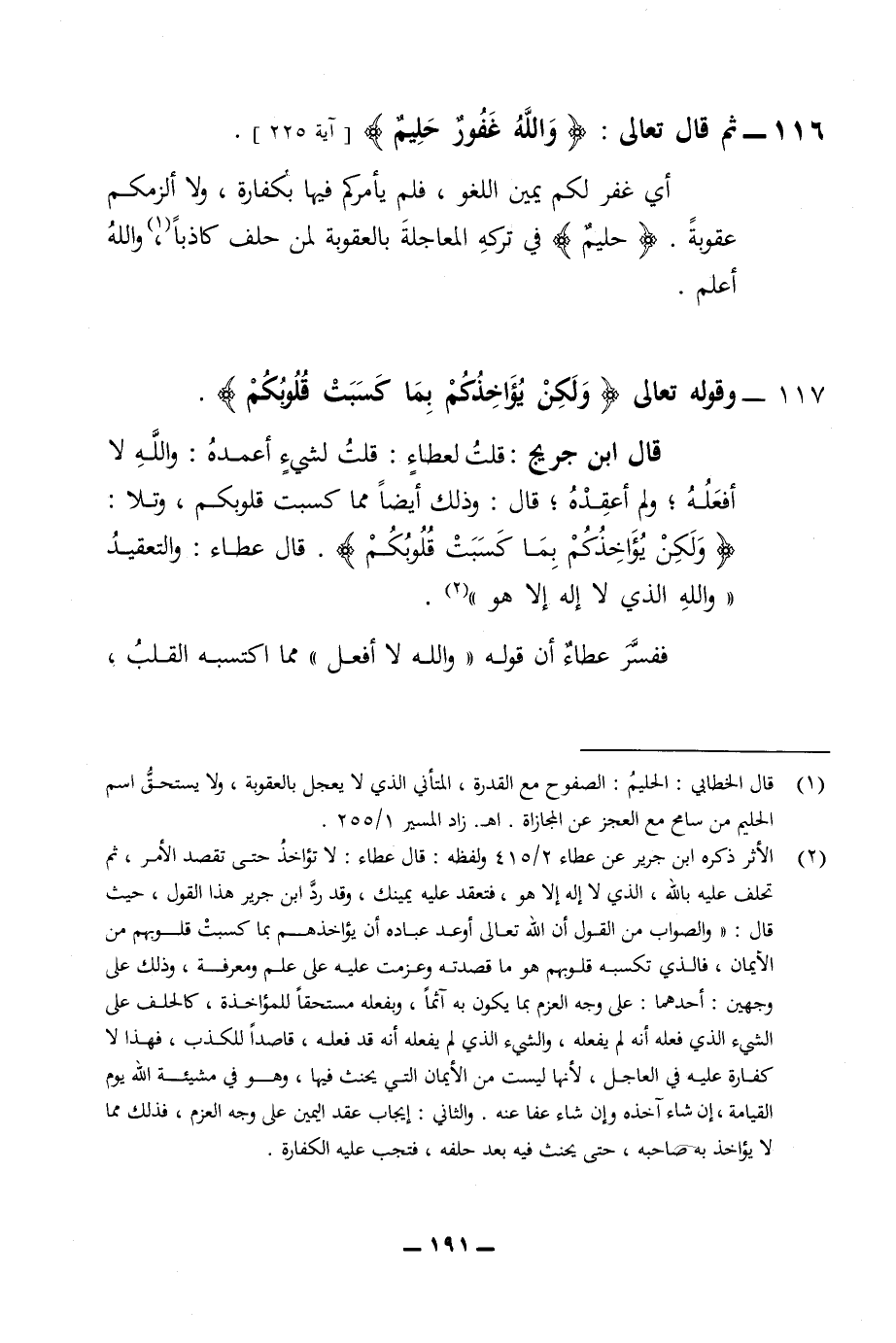 116 - ثم قال تعالى والله غفور حليم أي غفر لكم يمين اللغو فلم يأمركم فيها بكفارة ولا إلزامكم عقوبة حليم في تركه المعاجلة بالعقوبة لمن حلف كاذبا والله اعلم 117 - وقوله تعالى ولكن يؤاخذكم بما كسبت قلوبكم قال ابن جريج قلت لعطاء قلت لشئ اعمده محمد والله لا افعله ولم أعقده قال وذلك أيضا مما كسبت قلوبكم وتلا ولكن يؤاخذكم بما كسبت قلوبكم قال عطاء والتعقيد والله الذي لا اله الا هو ففسر عطاء ان قوله والله لا افعل مما اكتسبه القلب