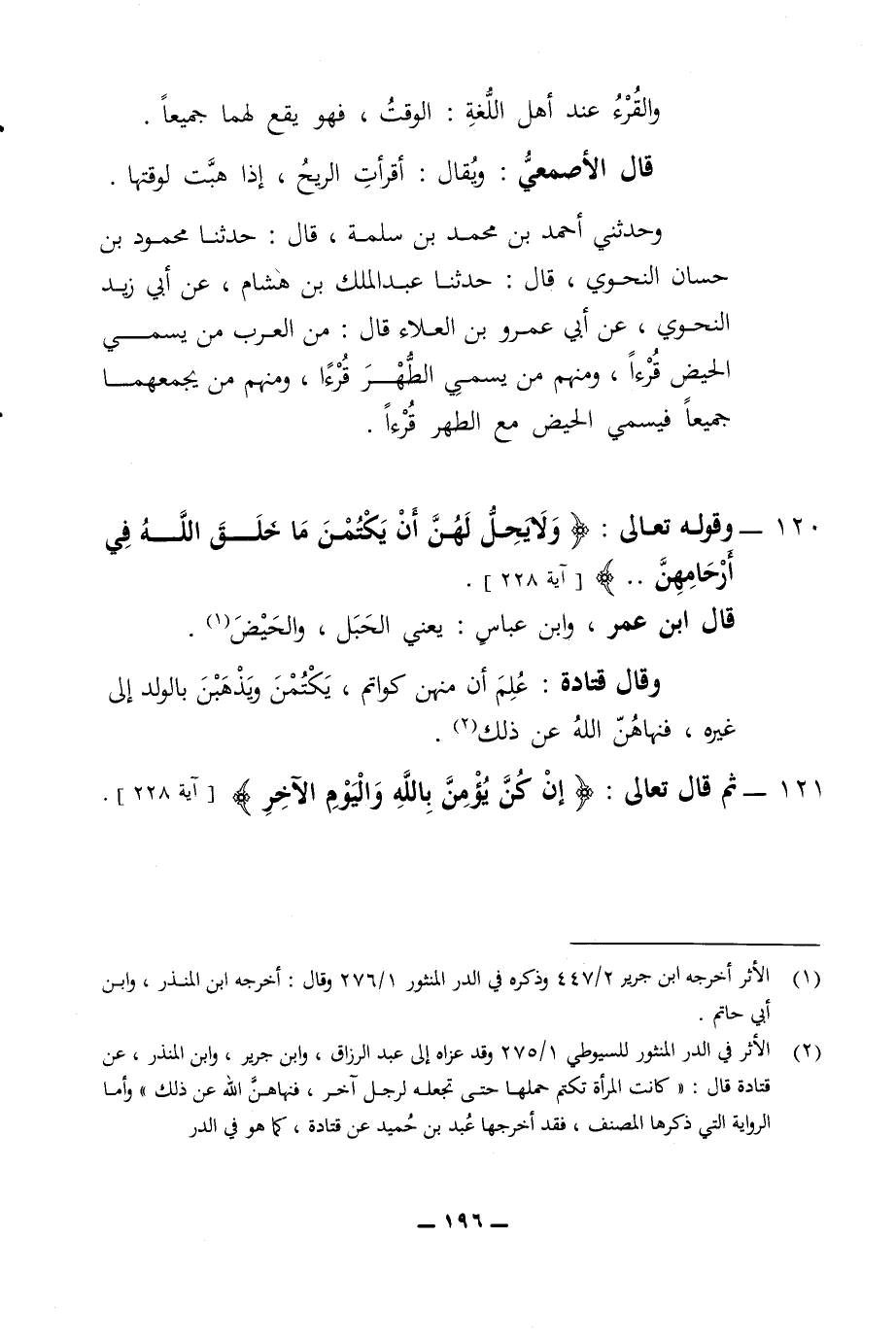 والقرء عند أهل اللغة الوقت فهو يقع لهما جميعا قال الأصمعي ويقال أقرأت الريح إذا هبت لوقتها وحدثني احمد بن محمد بن سلمة قال حدثنا محمود بن حسان النحوي قال حدثنا عبد الملك بن هشام عن ابي يزيد النحوي عن ابي عمرو بن العلاء قال من العرب من يسمي الحيض قرءا ومنهم من يسمي الطهر قرءا ومنهم من يجمعهما جميعا فيسمى الحيض مع الطهر قرءا 120 - وقوله تعالى ولا يحل لهن ان يكتمن ما خلق الله في أرحامهن وقال ابن عمر وابن عباس يعني الحبل والحيض وقال قتادة علم ان منهن كواتم يكتمن ويذهبن بالولد الى غيره فنها هن الله عن ذلك 121 - ثم قال تعالى ان كن يؤمن بالله واليوم الاخر