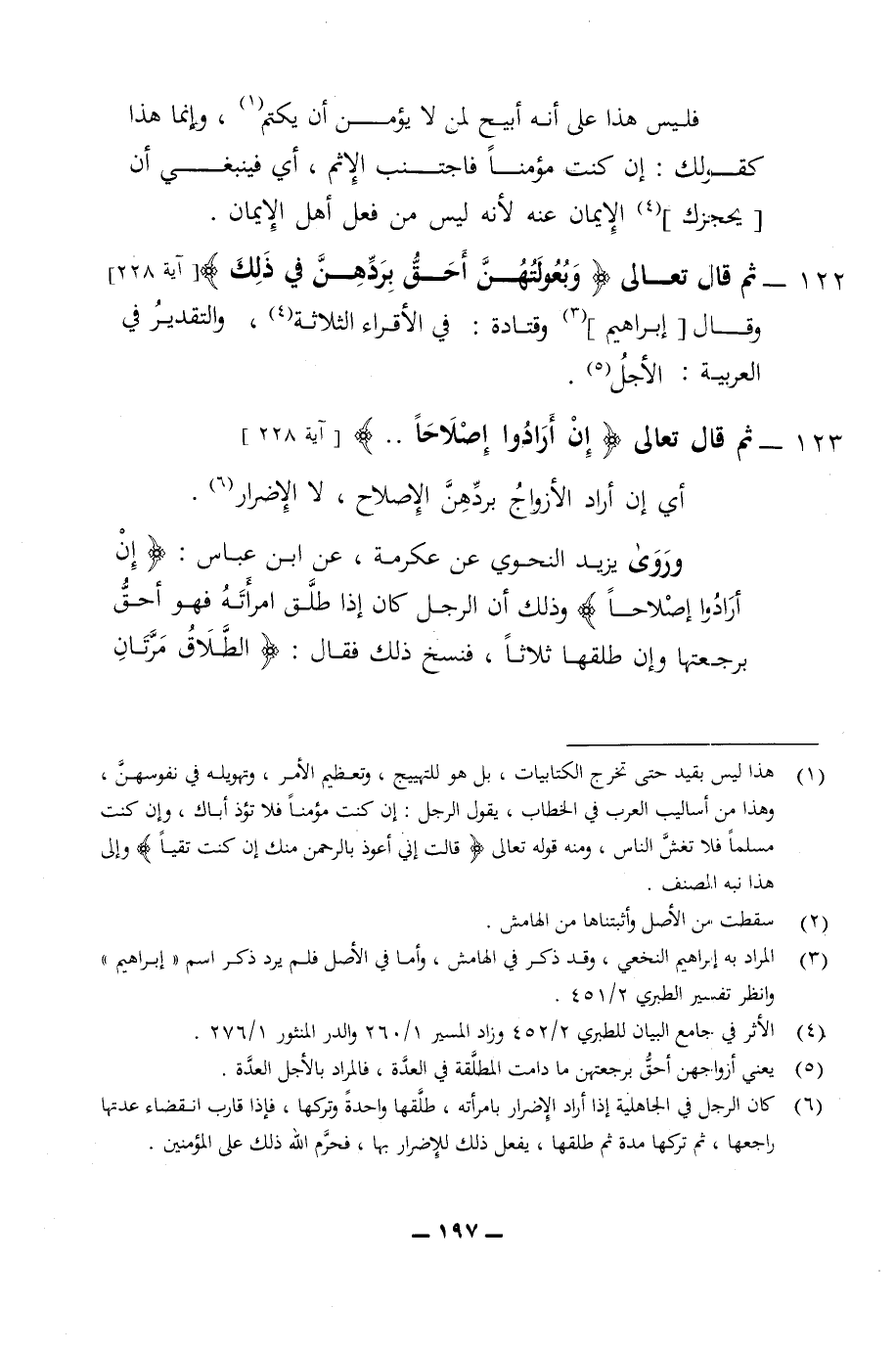 كقولك ان كنت مؤمنا فاجتنب الإثم أي فينبغي ان يحجزك الأيمان عنه لانه ليس من فعل أهل الأيمان 122 - ثم قال تعالى وبعولتهن أحق بردهن في ذلك وقال إبراهيم وقتادة في الإقراء الثلاثة والتقدير في العربية الأجل 123 - ثم قال تعالى ان أرادوا إصلاحا أي ان أراد الأزواج بردهن الإصلاح الاضرار وروى يزيد النحوي عن عكرمة عن ابن عباس ان أرادوا إصلاحا وذلك ان الرجل كان إذا طاق امرأته فهو أحق برجعتها وان طلقها ثلاثا فنسخ ذلك فقال الطلاق مرتان