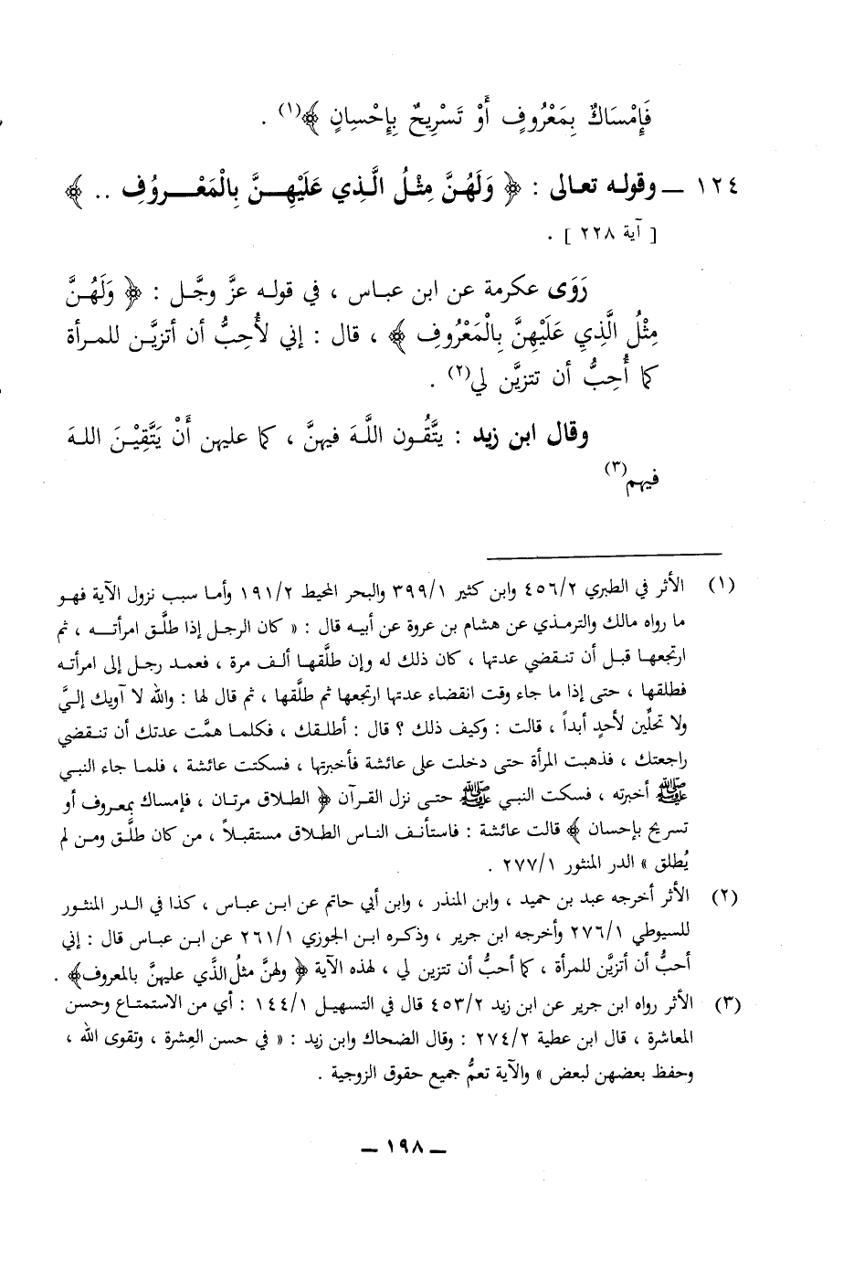 فإمساك بمعروف أو تسريح بإحسان 124 - وقوله تعالى ولهن مثل الذي عليهن بالمعروف روى عكرمة عن ابن عباس في قوله عز وجل ولهن مثل الذي عليهن بالمعروف قال أني لأحب ان أتزين للمرأة كما احب ان تتزين لي وقال ابن زيد يتقون الله فيهن كما عليهن ان يتقين الله فيهم