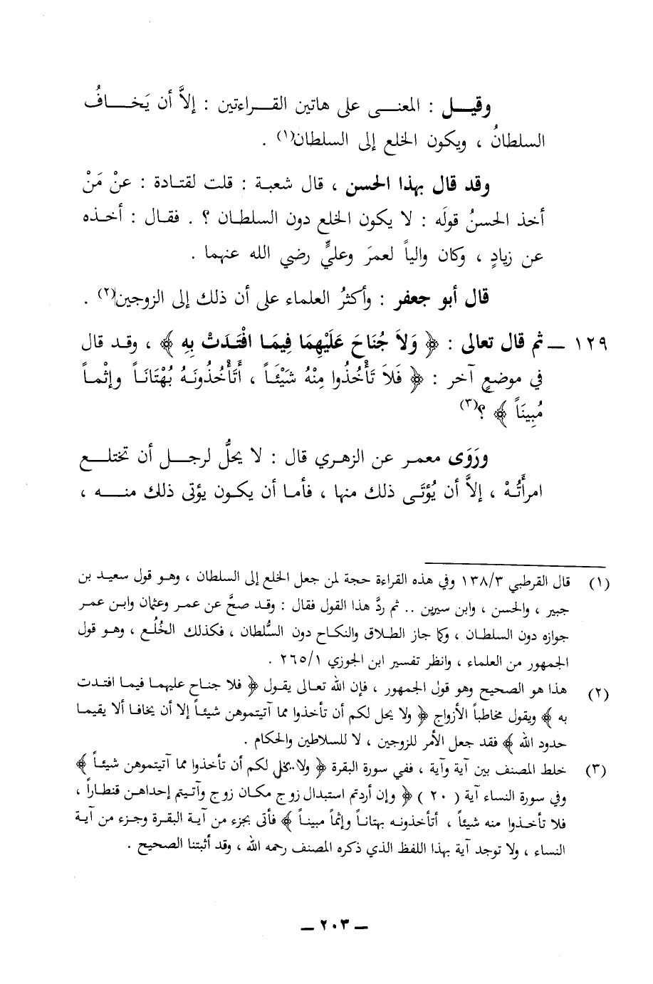 129 - ثم قال تعالى ولا جناح عليهما فيما افتدت به وقد قال في موضع اخر فلا تأخذوا منه شيئا أتأخذونه بهتانا وآثما مبينا وروى معمر عن الزهري قال لا يحل لرجل ان تختلع امرأته الا ان يؤتى ذلك منها فأما ان يكون يؤتى ذلك منه
