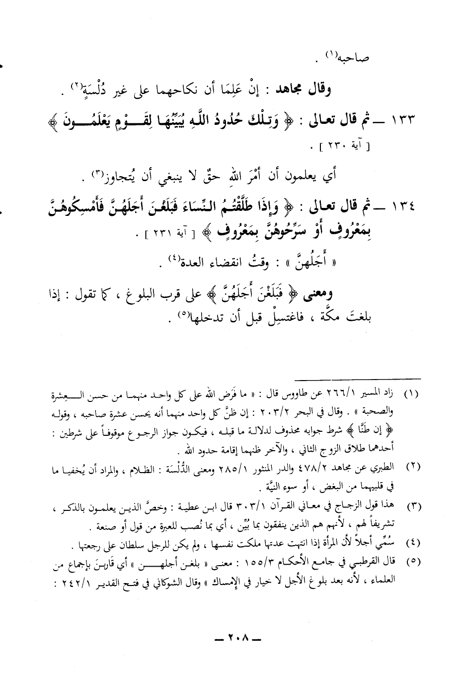 وقال مجاهد ان علما ان نكاحهما على غير دلسة 133 - ثم قال تعالى وتلك حدود الله يبينها لقوم يعلمون أي يعلمون ان أمر الله حق لا ينبغي ان يتجاوز 134 - ثم قال تعالى وإذا طلقتم النساء فبلغن أجاهن عبد فأمسكوهن بمعروف أو سرحوهن بمعروف أجلهن وقت انقضاء العدة ومعنى فبلغن أجلهن على قرب البلوغ كما تقول إذا بلغت مكة فاغتسل قبل ان تدخلها