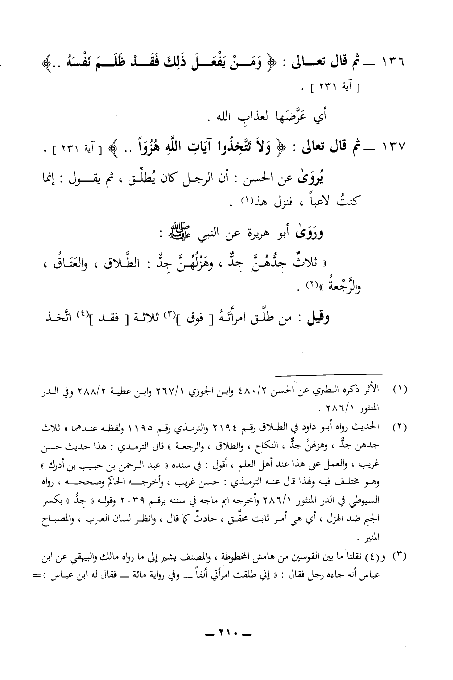 136 - ثم قال تعالى ومن يفعل ذلك فقد ظلم نفسه أي عرضها لعذاب الله 137 - ثم قال تعالى ولا تتخذوا آيات الله هزوا يروى عن الحسن ان الرجل كان يطلق ثم يقول إنما كنت لاعبا فنزل هذا