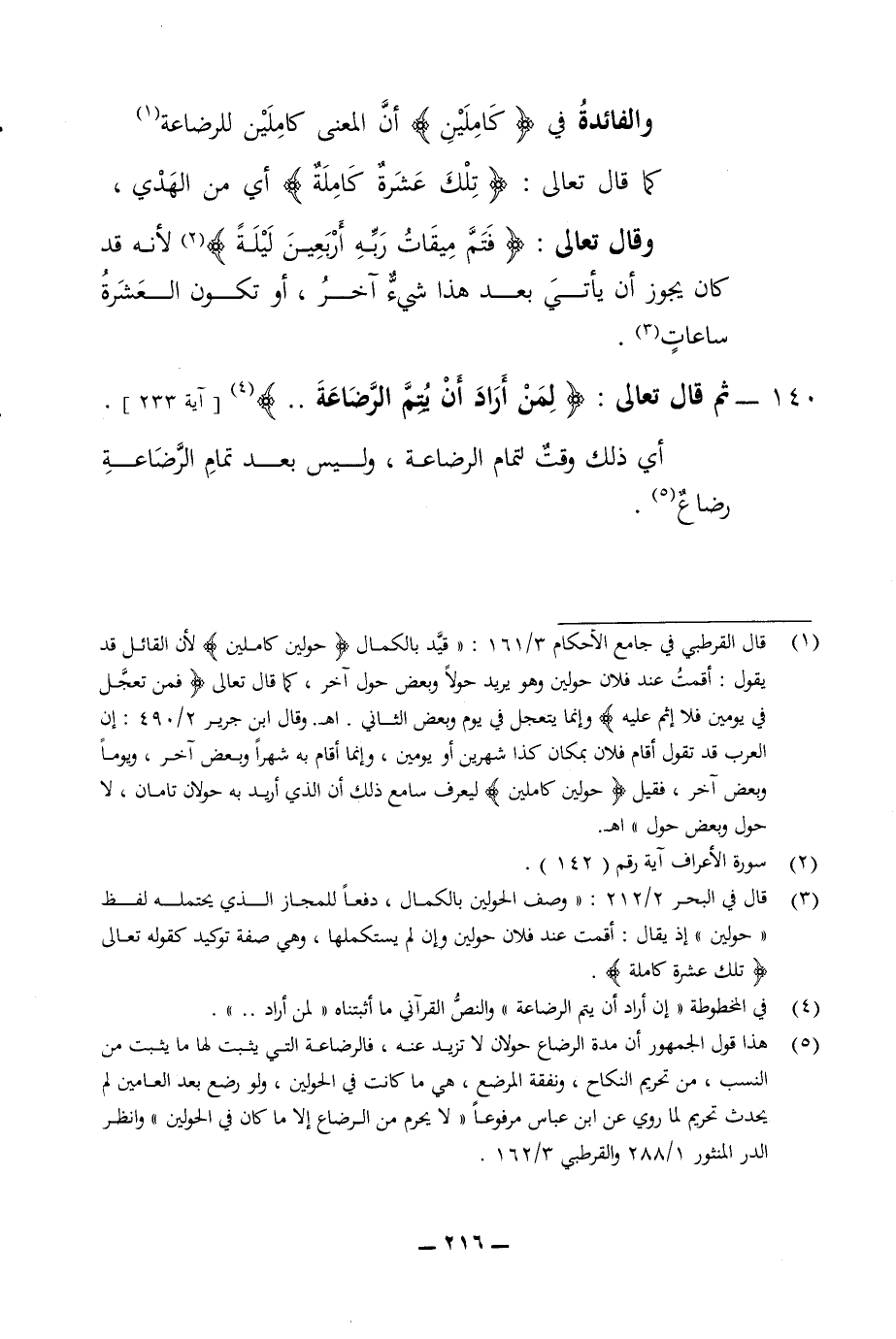 والفائدة في كاملين ان المعنى كاملين للرضاعة كما قال تعالى تلك عشرة كاملة أي من الهدي وقال تعالى فتم ميقات ربه أربعين ليلة لانه قد كان يجوز ان ياتي بعد هذا شئ اخر أو تكون العشرة ساعات 140 - ثم قال تعالى لمن اراد ان يتم الرضاعة أي ذلك وقت لتمام الرضاعه وليس بعد تمام الرضاعة رضاع