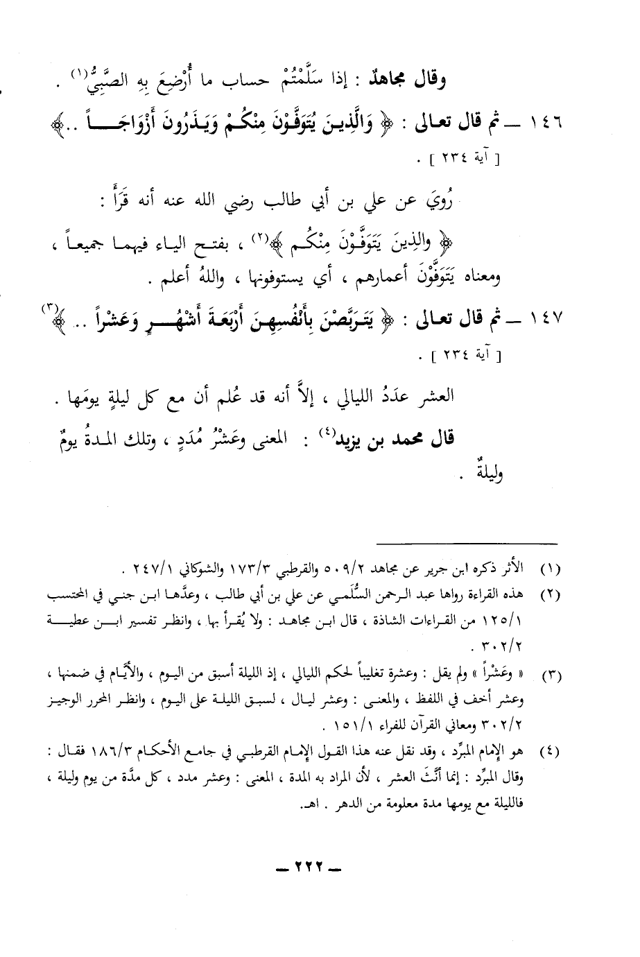 وقال مجاهد إذا سلمتم حساب ما ارضع به الصبي 146 - ثم قال تعالى والذين يتوفون منكم ويذرون ازواجا روي عن علي بن ابي طالب رضي الله عنه انه قرأ والذين يتوفون منكم بفتح الياء فيهما جميعا ومعناه يتوفون اعمارهم أي يستوفونها والله اعلم 147 - ثم قال تعالى يتربصن بانفسهن اربعة اشهر وعشرا العشر عدد الليالي الا انه قد علم ان مع كل ليلة يومها قال محمد بن يزيد المعنى وعشر مدد وتلك المدة يوم وليلة