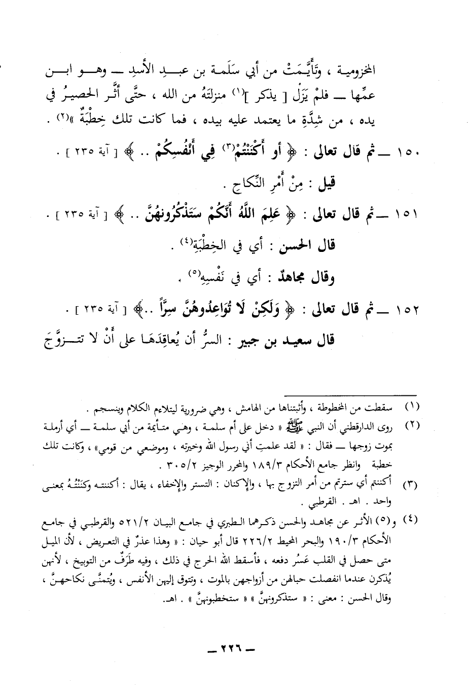 المخزومية وتأيمت من ابي سلمة بن عبد الاسد وهو ابن عمها فلم يزل يذكر منزلته من الله حتى اثر الحصير في يده من شدة ما يعتمد عليه بيده فما كانت تلك خطبة 150 - ثم قال تعالى أو أكننتم في انفسكم قيل من أمر النكاح 151 - ثم قال تعالى علم الله انكم ستذكرونهن قال الحسن أي في الخطبة وقال مجاهد أي في نفسه 152 - ثم قال تعالى ولكن لا تواعدوهن سرا قال سعيد بن جبير السر ان يعاقدها الله على ان لا تتزوج
