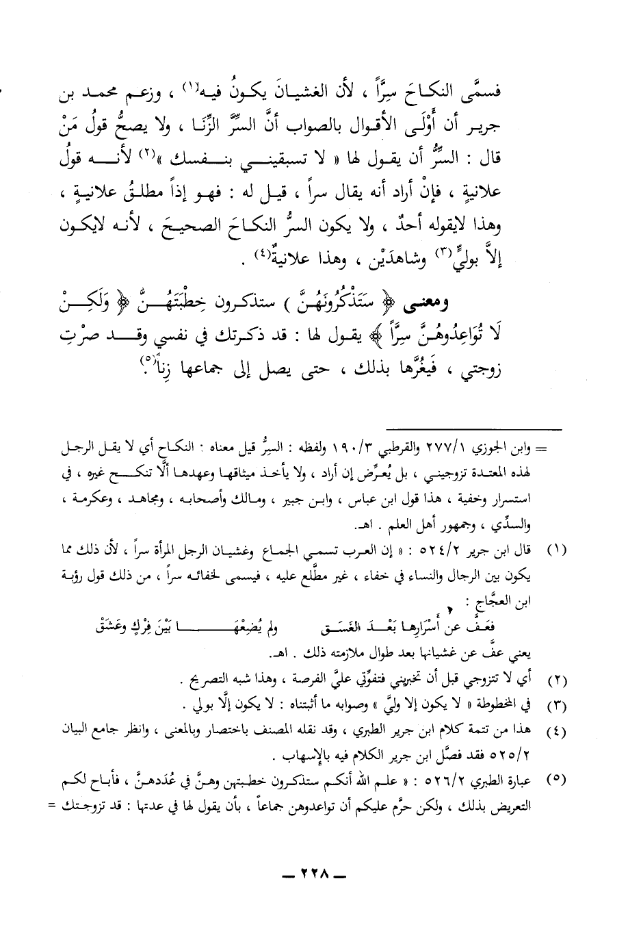 فسمي النكاح سرا لان الغشيان يكون فيه وزعم محمد بن جرير ان اولى الاقوال باصواب ان السر الزنا ولا يصح قول من قال السر ان يقول لها ل تسبقيني بنفسك لانه قول علانية فان اراد ان يقال سرا قيل له فهو إذا مطلق علانية وهذا لا يقوله احد ولا يكون السر النكاح الصحيح لانه لا يكون الا بولي وشاهدين وهذا علانية ومعنى ستذكرونهن ستذكرون خطبتهن ولكن لا تواعدوهن سرا يقال لها قد ذكرتك في نفسي وقد صرت زوجتي فبغرها قال بذلك حتى يصل الى جماعها زنا