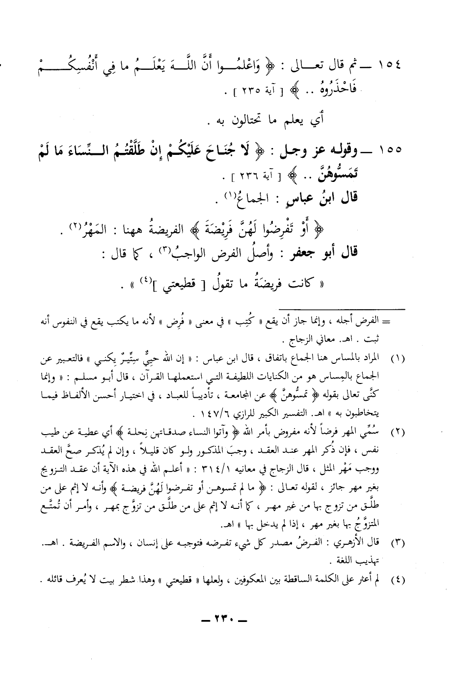 فاحذروه أي يعلم ما تحتالون به 155 - وقوله عز وجل لا جناح عليكم ان طلقتم النساء ما لم تمسوهن قال ابن عباس الجماع أو تفرضوا لهن فريضة الفريضة ههنا المهر قال أبو جعفر واصل الفرض الواجب كما قال كانت فريضة ما تقول قطيعتي