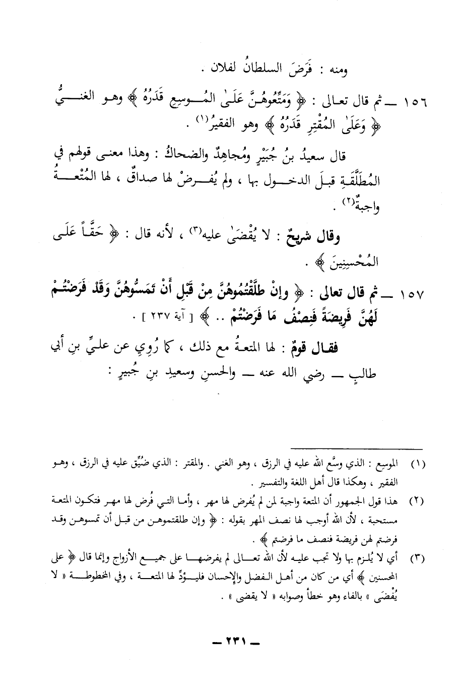 ومنه فرض السلطان لفلان 156 - ثم قال تعالى ومتعوهن على الموسع قدره وهو الغني وعلى المقتر قدره وهو الفقير قال سعيد ابن جبير ومجاهد والضحاك وهذا معنى قولهم في المطلقة قبل الدخول بها ولم يفرض لها صداق لها المتعة واجبة وقال شريح لا يقضى عليه لانه قال حقا على المحسنين 157 - ثم قال تعالى وان طلقتموهن من قبل ان تمسوهن وقد فرضتم لهن فريضة فنصف ما فرضتم فقال قوم لها المتعة مع ذلك كما روي عن علي ابن ابي طالب رضي الله عنه والحسن وسعيد ابن جبير