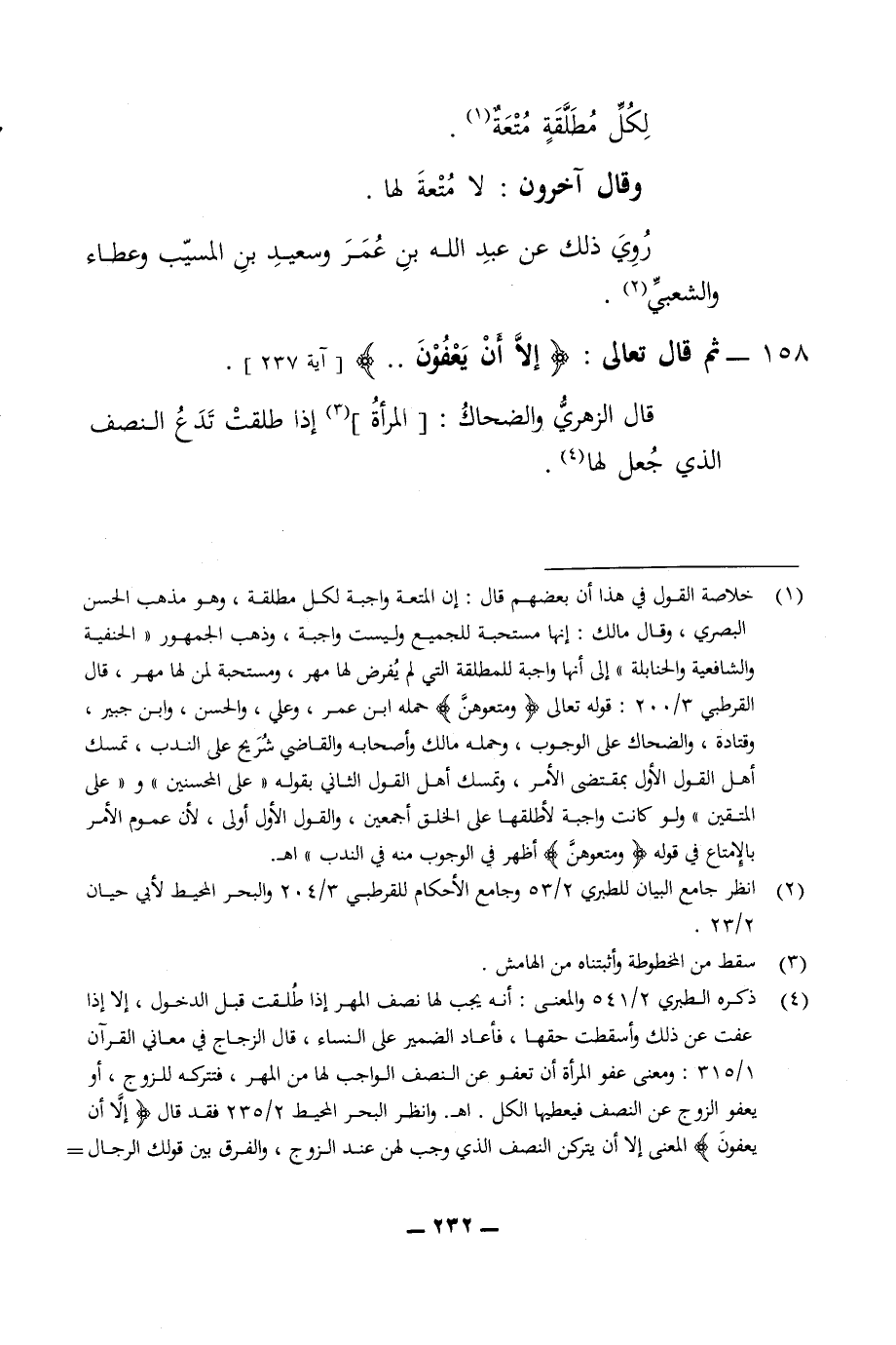 لكل مطلقة متعه وقال آخرون لا متعة لها روي ذلك عن عبد الله بن عمرو وسعيد بن المسيب وعطاء والشعبي 158 - ثم قال تعالى إلا أن يعفون قال الزهري والضحاك المرأة إذا طلقت تدع النصف الذي جعل لها