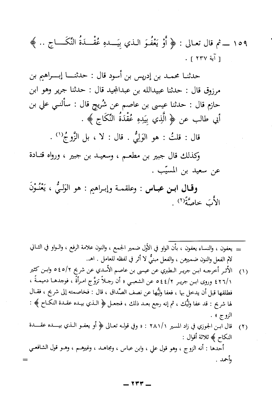 159 - ثم قال تعالى أو يعفو الذي بيده عقدة النكاح حدثنا محمد ابن إدريس بن اسود قال حدثنا ابر أهيم بن مرزوق قال حدثنا عبيد الله بن عبد المجيد قال حدثنا جرير وهو ابن حازم قال حدثنا عيسى ابن عاصم عن شريح قال سألني علي بن أبي طالب عن الذي بيده عقدة النكاح قال قلت هو الولي قال لا بل الزوج وكذلك قال جبير بن مطعم وسعيد بن جبير ورواه قتادة عن سعيد بن المسيب وقال ابن عباس وعلقمة وإبراهيم هو الولي يعنون الأب خاصة