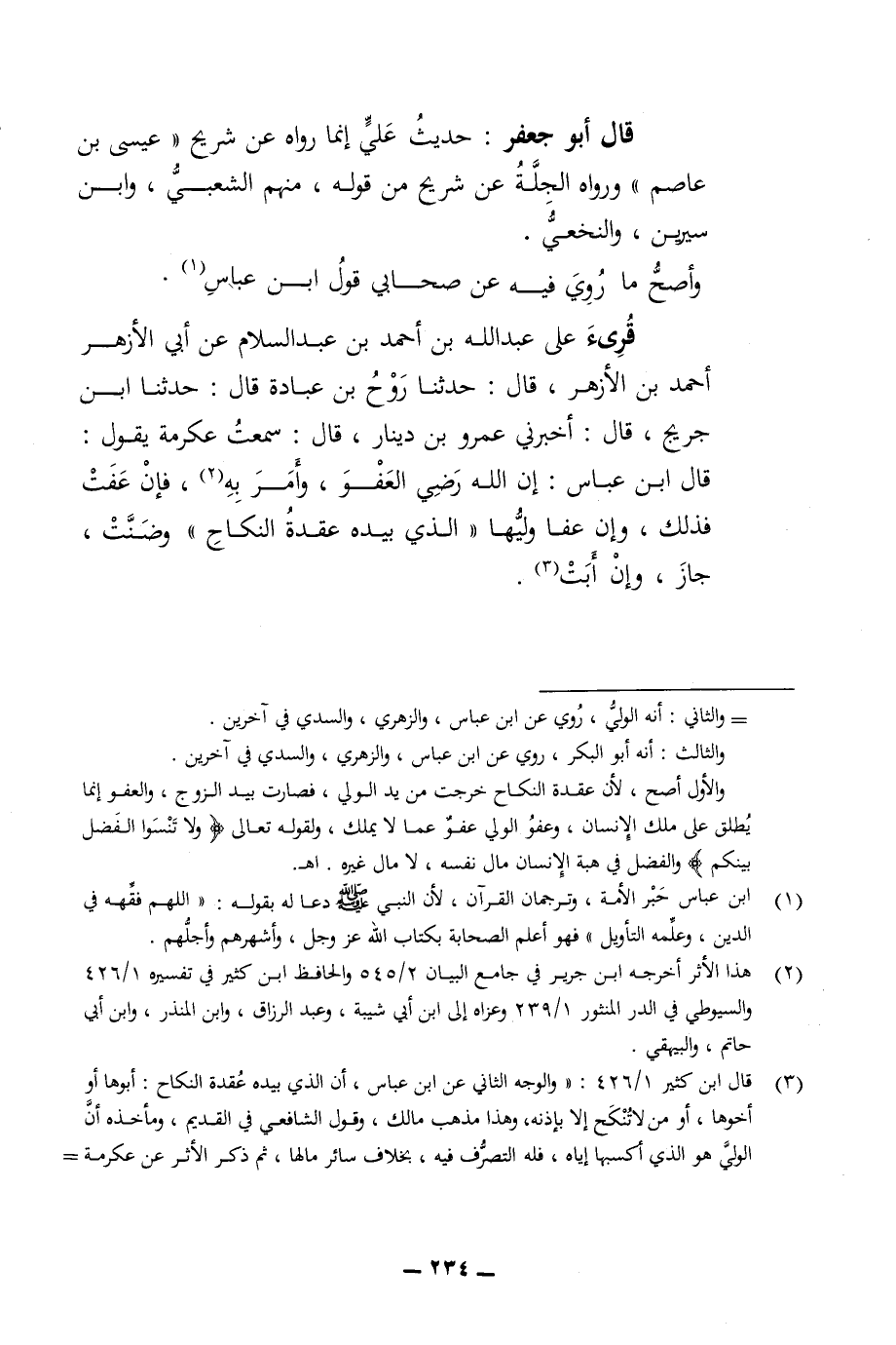 واصح ما روي فيه عن صحابي قول ابن عباس قرئ على عبد الله بن احمد بن عبد السلام عن ابي الأزهر احمد بن الأزهر قال حدثنا روح بن عبادة قال حدثنا ابن جريج قال اخبرني عمرو ابن دينار قال سمعت عكرمة يقول قال ابن عباس ان الله رضي العفو وأمر به فان عفت فذلك وان عفا وليها الذي بيده عقدة النكاح وضنت جاز وان أبت