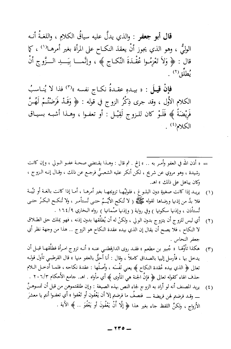 قال أبو جعفر والذي يدل عليه سياق الكلام واللغة انه الولي وهو الذي يجوز ان يعقد النكاح على المرأة بغير أمرها كما قال ولا تعزموا عقدة النكاح وإنما بيد الزوج ان يطلق فان قيل بيده عقدة نكاح نفسه فذا لا يناسب الكلام الأول وقد جرى ذكر الزوج في قوله وقد فرضتم لهن فريضة فلو كان للزوج لقيل أو تعفوا وهذا أشبه بسياق الكلام
