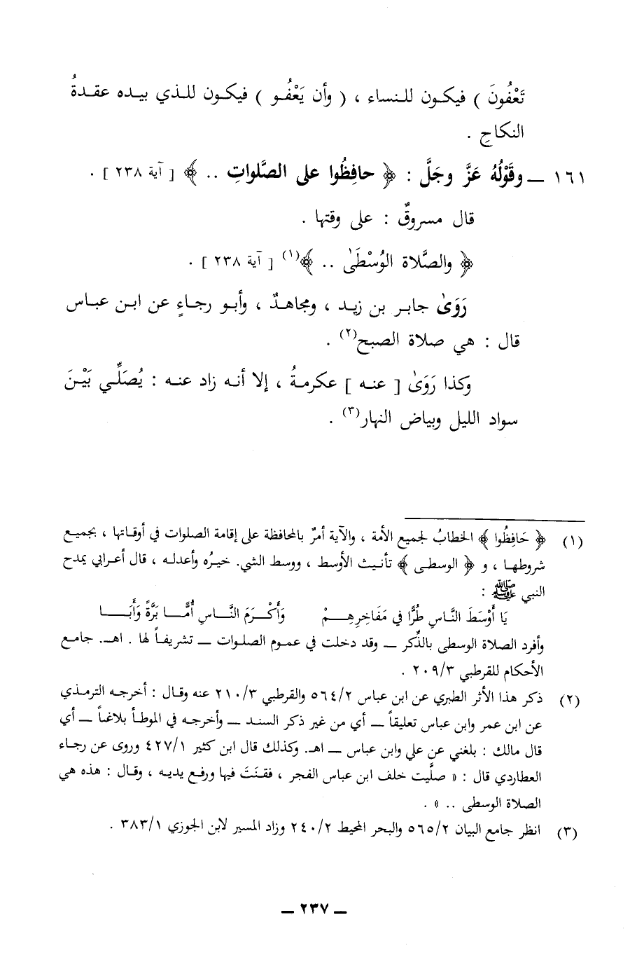 تعفون فيكون للنساء وان يعفو فيكون للذي بيده عقدة النكاح 161 - وقوله عز وجل حافظوا على الصلوات قال مسروق على وقتها والصلاة الوسطى روى جابر بن زيد ومجاهد وأبو رجاء عن ابن عباس قال هي صلاة الصبح وكذا روى عنه عكرمة الا انه زاد عنه يصلي بين سواد الليل وبياض النهار
