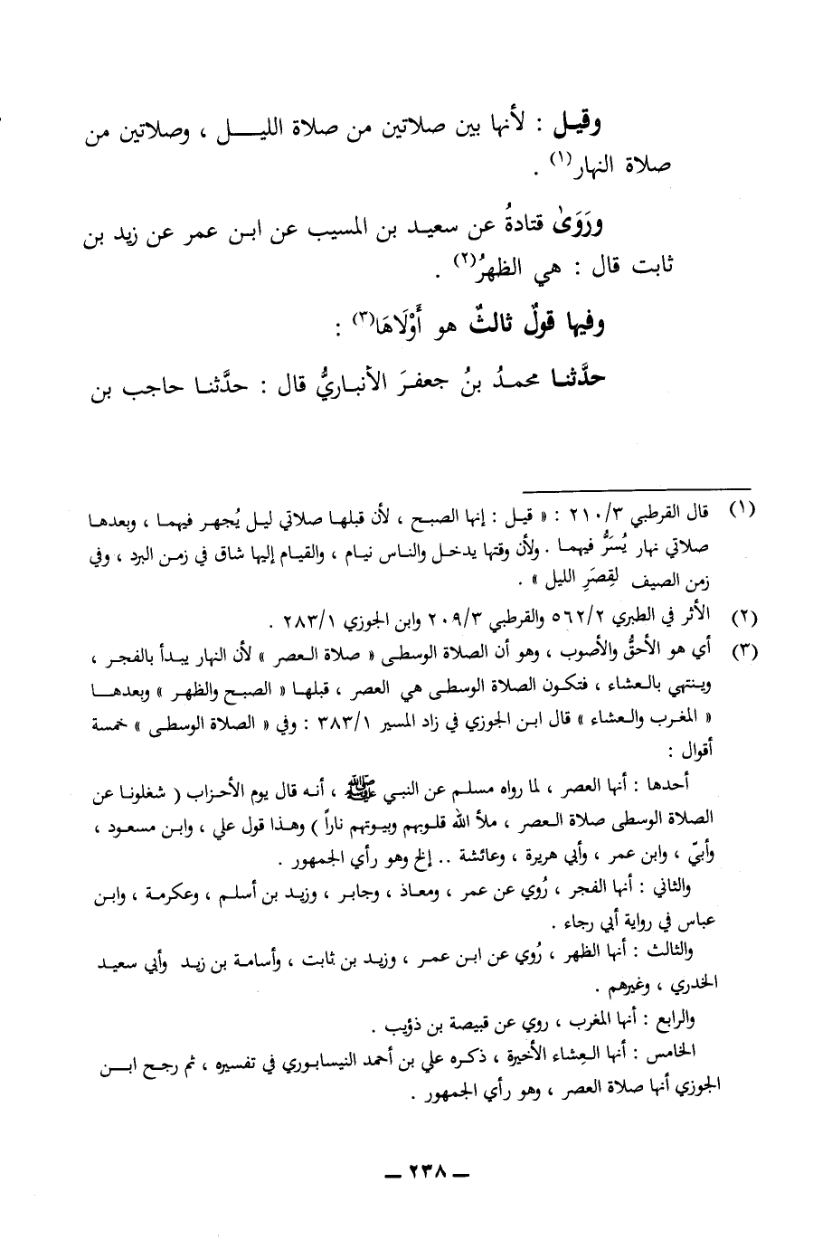 وقيل لانها بين صلاتين من صلاة الليل وصلاتين من صلاة النهار وروى قتادة عن سعيد بن المسيب عن ابن عمر عن بن زيد بن ثابت قال هي الظهر وفيها قول ثالث هو أولاها حدثنا محمد بن جعفر ألا نباري قال حدثنا حاجب بن