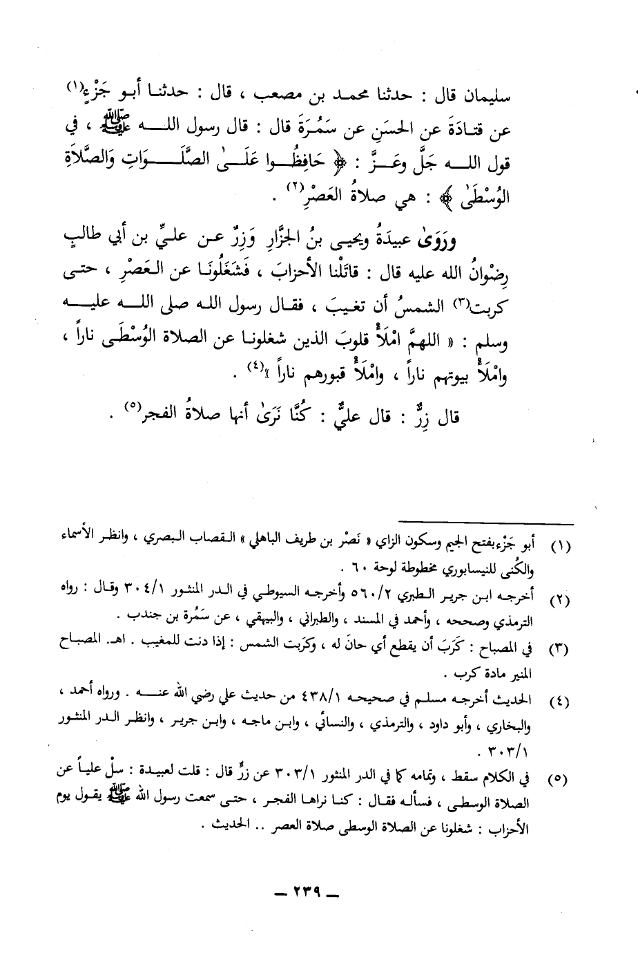 سليمان قال حدثنا محمد بن مصعب قال حدثنا أبو جزء عن قتادة عن الحسن عن سمرة قال قال رسول الله صلى الله عليه وسلم في قول الله جل وعز حافظوا على الصلوات والصلاة الوسطى هي صلاة العصر وروى عبدة ويحيى بن الجزار وزر عن علي ابن ابي طالب رضوان الله عليه قال قاتلنا الأحزاب فشغلونا عن العصر حتى كربت الشمس ان تغيب فقال رسول الله صلى الله عليه اللهم ابلاء قلوب الذين شغلونا عن الصلاة الوسطى نارا وإملاء بيوتهم نارا وإملاء قبورهم نارا قال زر قال علي كنا نرى انها صلاة الفجر