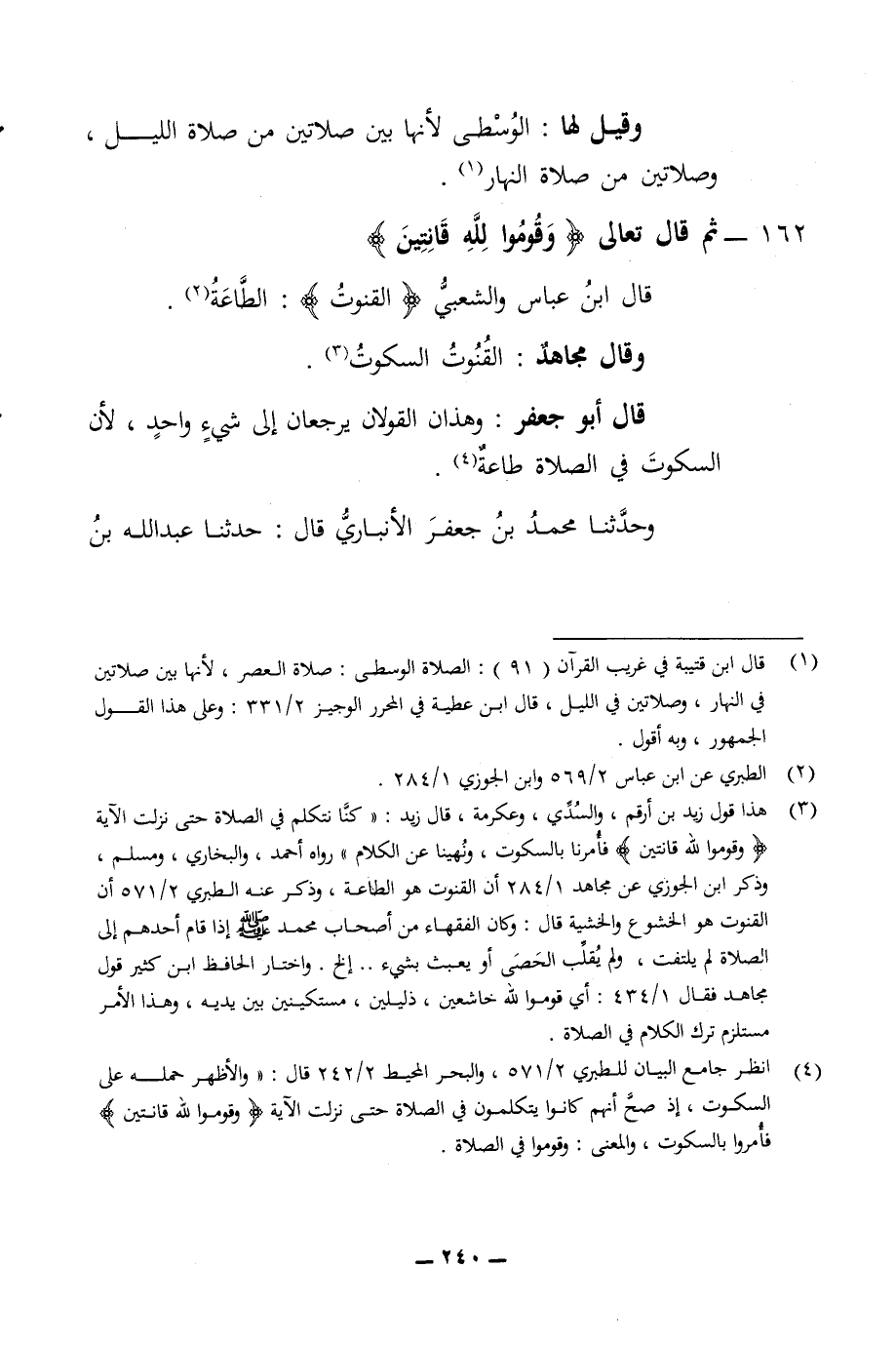 وقيل لها الوسطى لانها بين صلاتين من صلاة الليل وصلاتين من صلاة النهار 162 - ثم قال تعالى وقوموا لله قانتين قال ابن عباس والشعبي القنوت الطاعة وقال مجاهد القنوت السكوت قال أبو جعفر وهذان القولان يرجعان الى شئ واحد لان السكوت في الصلاة طاعة وحدثنا محمد بن جعفر ألا نباري قال حدثنا عبد الله بن