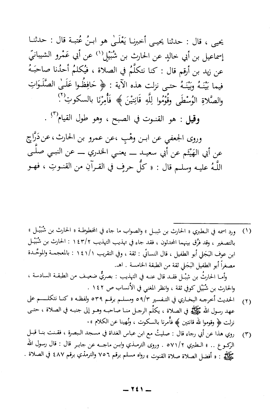 عن زيد بن أرقم قال كنا نتكلم في الصلاة فيكلم أحدنا صاحبه فيما بينه وبينه حتى نزلت هذه الآية حافظوا على الصلوات والصلاة الوسطى وقوموا لله قانتين فأمرنا بالسكوت وقيل هو القنوت في الصبح وهو طول القيام وروى الجعفي عن بن وهب عن عمرو بن الحارث عن دراج عن ابي الهيثم عن ابي سعيد يعني الخدري عن النبي صلى الله عليه وسلم قال كل حرف في القرآن من القنوت فهو