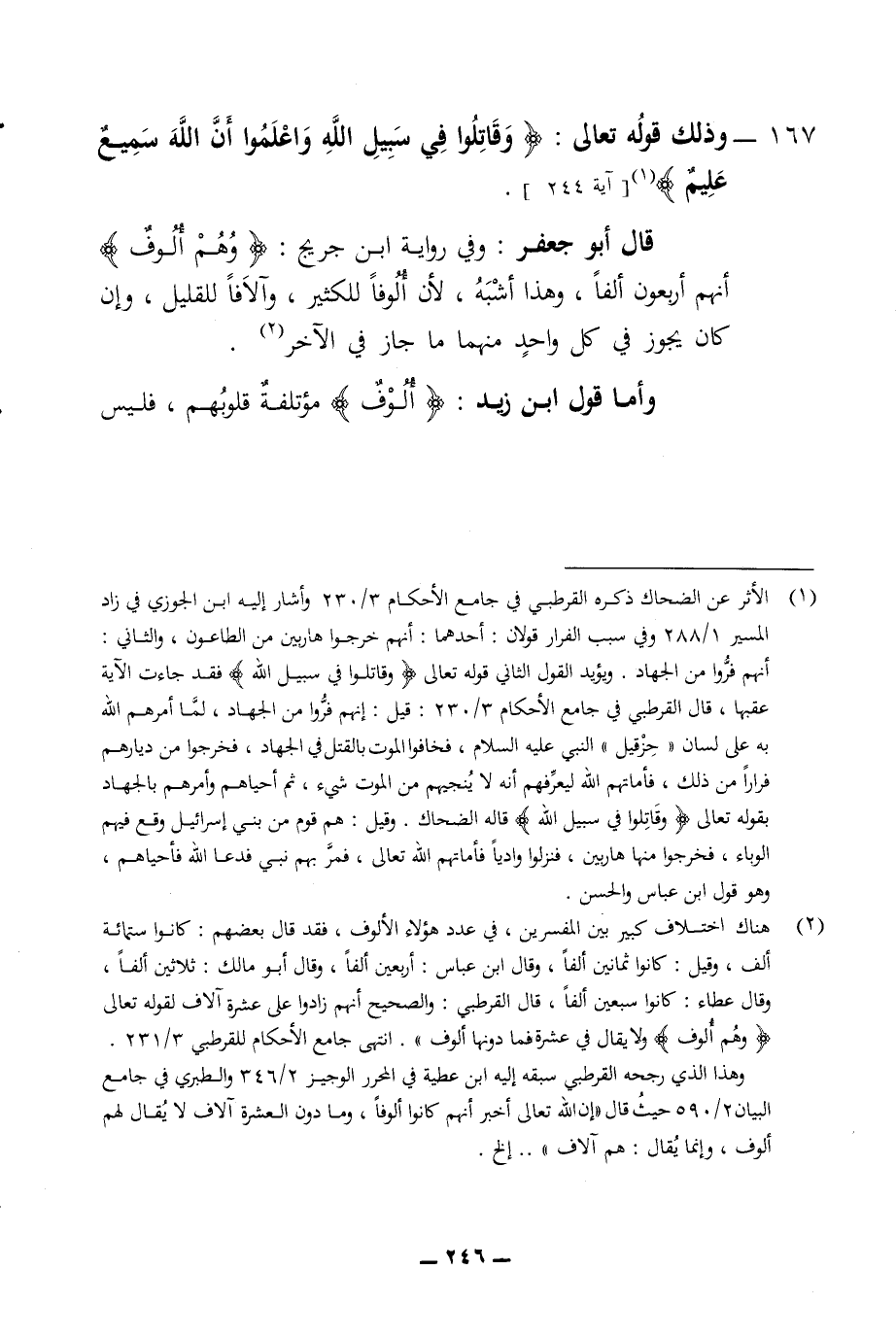 وذلك قوله تعالى وقاتلوا في سبيل الله واعلموا ان الله سميع عليم قال أبو جعفر وفي رواية ابن جريج وهم الوف انهم اربعون الفا وهذا اشبه لان الوفا للكثير وآلافا للقليل وان كان يجوز في كل واحد منهما ما جاز في الاخر واما قول ابن زيد الوف مؤتلفة قلوبهم فليس