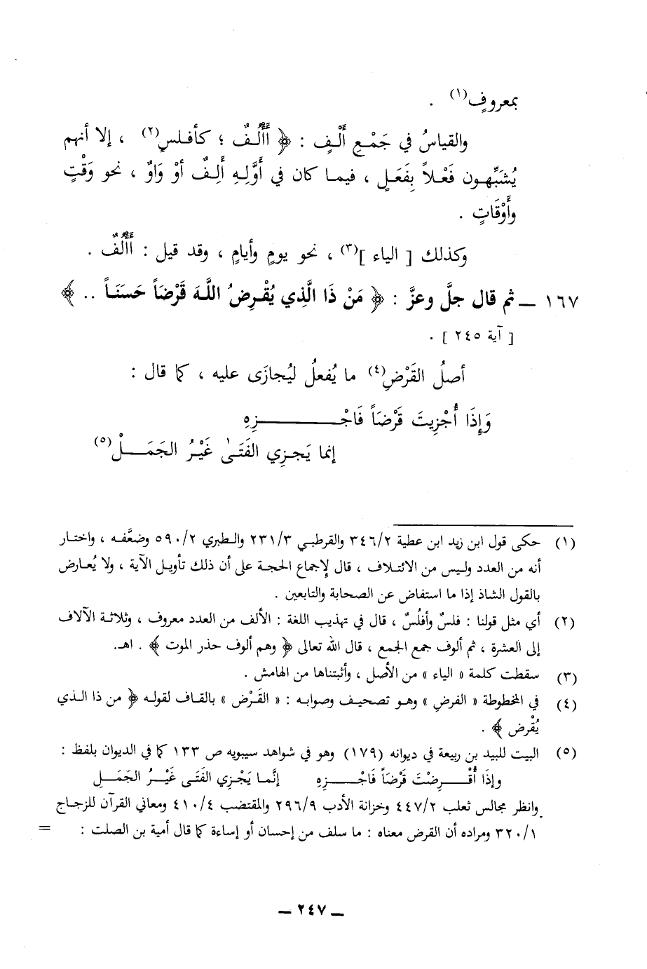 بمعروف والقياس في جمع الف أألف كأفلس الا انهم يشبهون فعلا بفعل فيما كان في اوله الف أو واو نحو وقت واوقات وكذلك الياء نحو يوم وايام وقد قيل أألف 167 - ثم قال جل وعز من ذا الذي يقرض الله قرضا حسنا أصل القرض ما يفعل ليجازى عليه كما قال * وإذا اجزيت هذه قرضا فاجزه * انما يجزي الفتى غير الجمل *