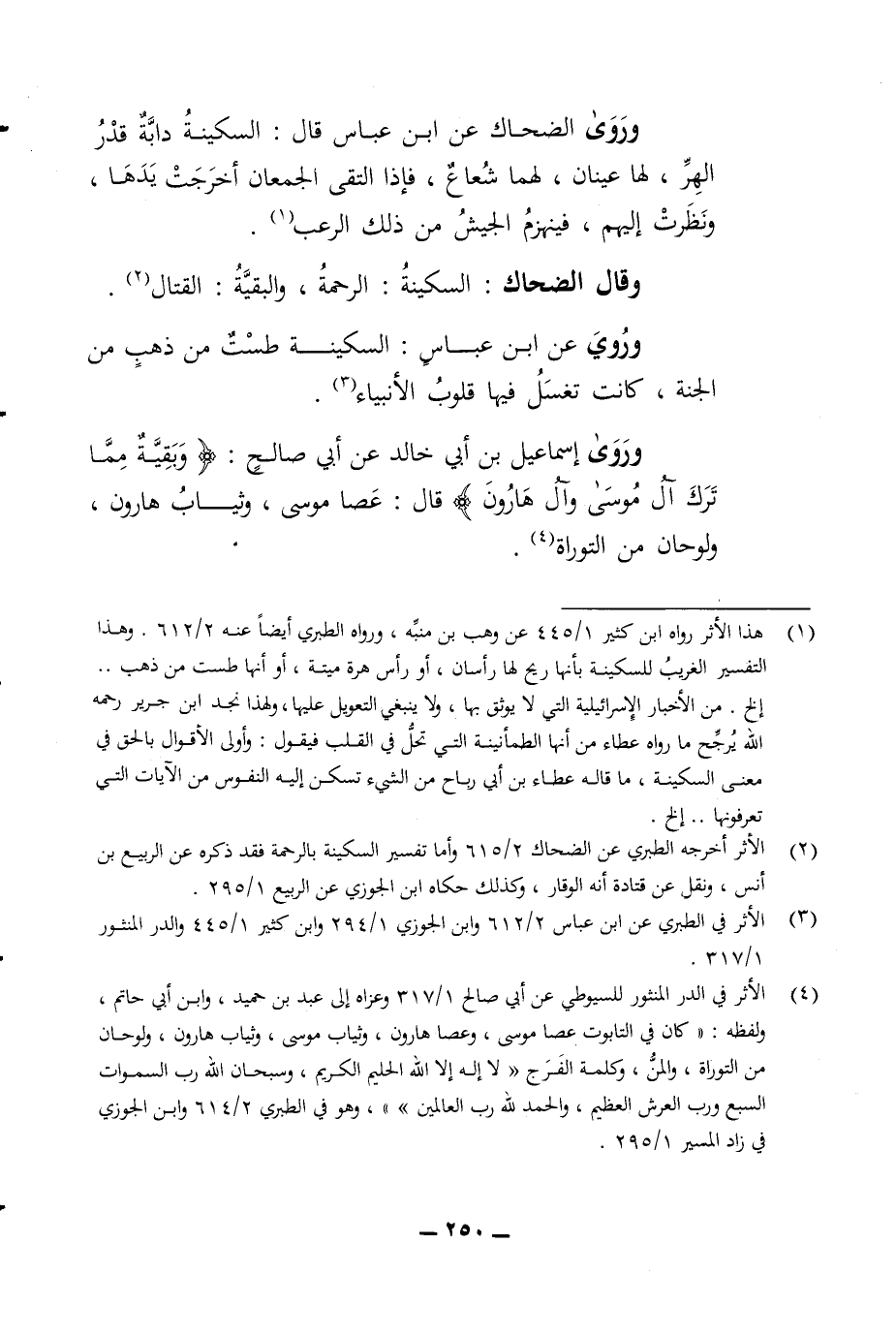 وروى الضحاك عن ابن عباس قال السكينة دابة قدر الهر لها عينان لهما شعاع فإذا التقى الجمعان اخرجت يدها