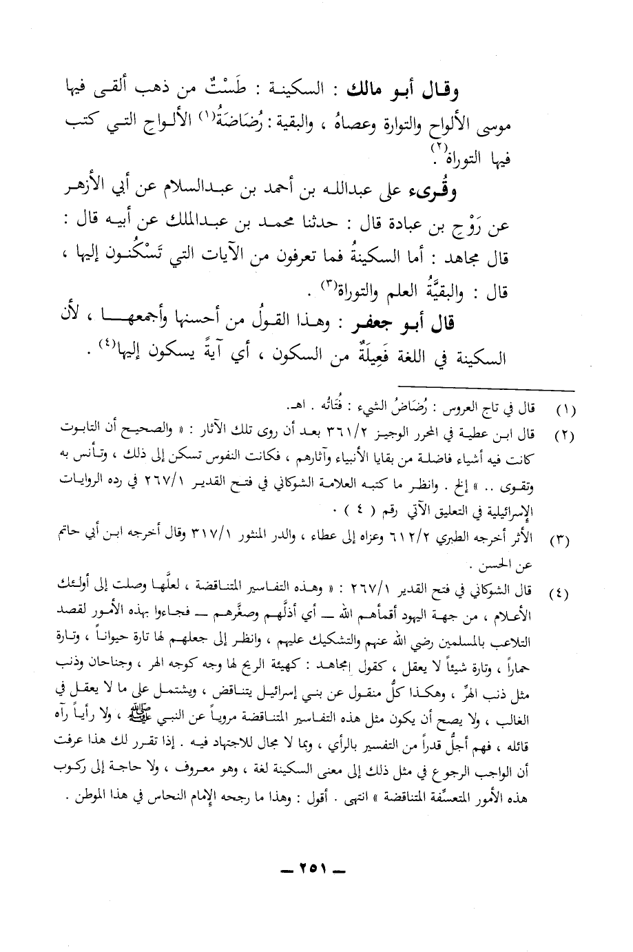 وقال أبو مالك السكينة طست من ذهب القى فيها موسى الالواح والتوراة وعصاه والبقية رضاضة الالواح التي كتب فيها التوراة وقرئ على عبد الله بن أحمد بن عبد السلام عن ابي الازهر عن روح بن عبادة قال حدثنا محمد بن عبد الملك عن ابيه قال قال مجاهد اما السكينة فما تعرفون من الايات التي تسكنون إليها قال والبقية العلم والتوراة وقال أبو جعفر وهذا القول من احسنها وأجمعها لان السكينة في اللغة فعيلة من السكون أي آية يسكون إليها