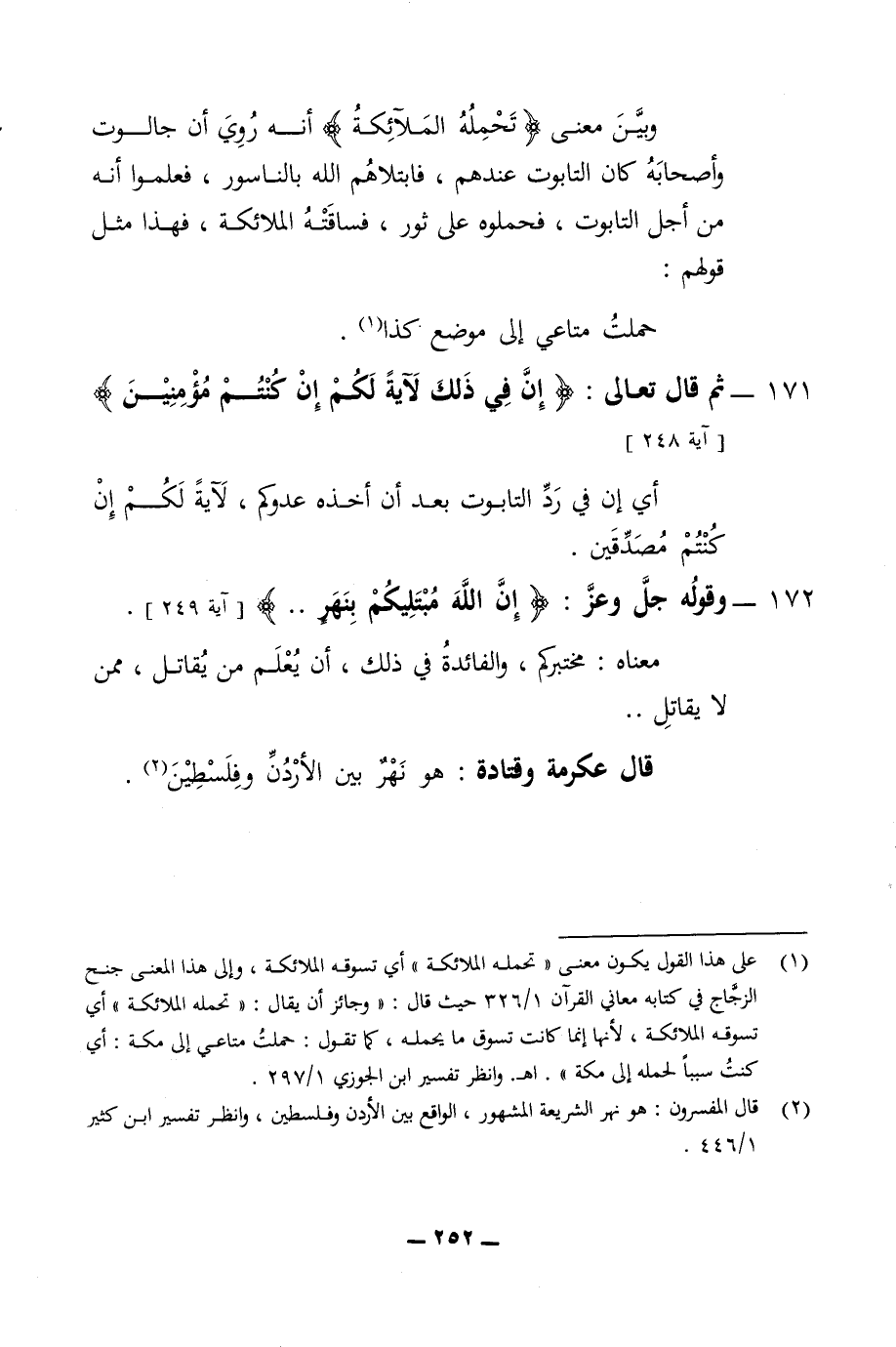 حملت متاعي الى موضع كذا 171 - ثم قال تعالى ان في ذلك لآية لكم ان كنتم مؤمنين أي ان في رد التابوت بعد ان اخذه عدوكم لآية لكم ان كنتم مصدقين 172 - وقوله جل وعز ان الله مبتليكم بنهر معناه مختبركم والفائدة في ذلك أن يعلم من يقاتل ممن لا يقاتل قال عكرمة وقتادة هو نهر بين الاردن وفلسطين