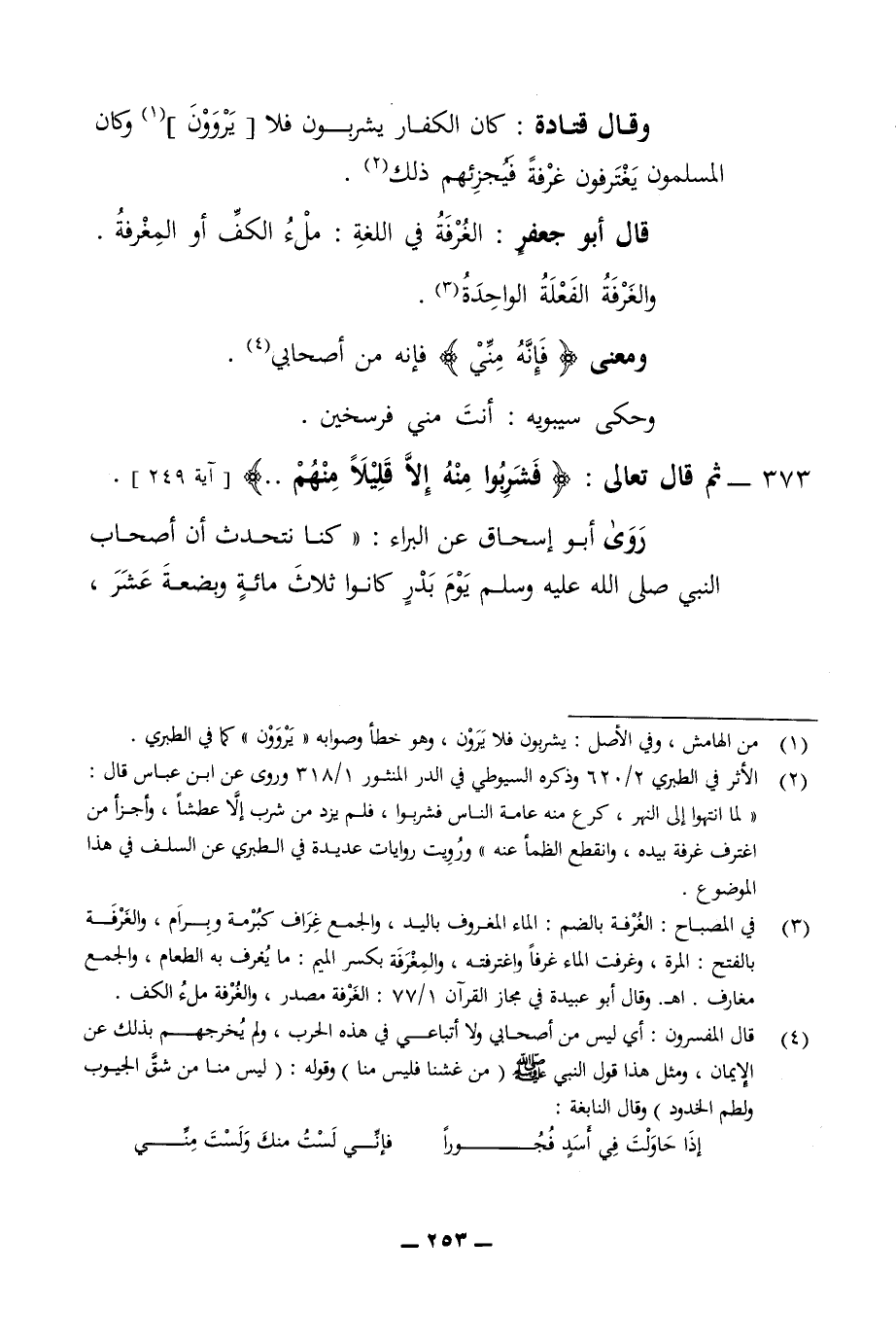 وقال قتادة كان الكفار يشربون فلا يرون وكان المسلمون يغترفون غرفة فيجزئهم ذلك قال أبو جعفر الغرفة في اللغة ملء الكف أو المغرفة والغرفة الفعلة الواحدة ومعنى فانه مني فانه من اصحابي وحكى سيبويه انت مني فرسخين 173 - ثم قال تعالى فشربوا منه الا قليلا منهم روى أبو اسحاق عن البراء كنا نتحدث ان اصحاب النبي صلى الله عليه وسلم يوم بدر كانوا ثلاث مائة وبضعة عشر