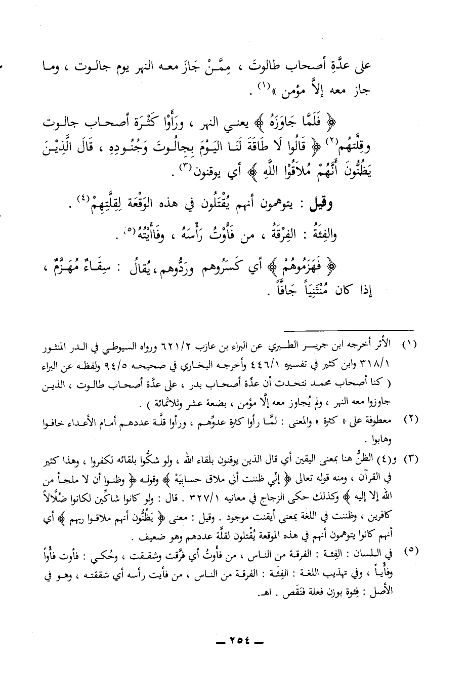 وقلتهم قالوا لا طاقة لنا اليوم بجالوت وجنوده قال الذين يظنون انهم ملاقوا الله أي يوقنون وقيل يتوهمون أنهم يقتلون في هذه الواقعة لقلتهم والفئة الفرقة من فأوت رأسه وفاأيته يحيى فهزموهم أي كسروهم وردوهم يقال سقاء مهزوم إذا كان منثنيا الرحمن جافا
