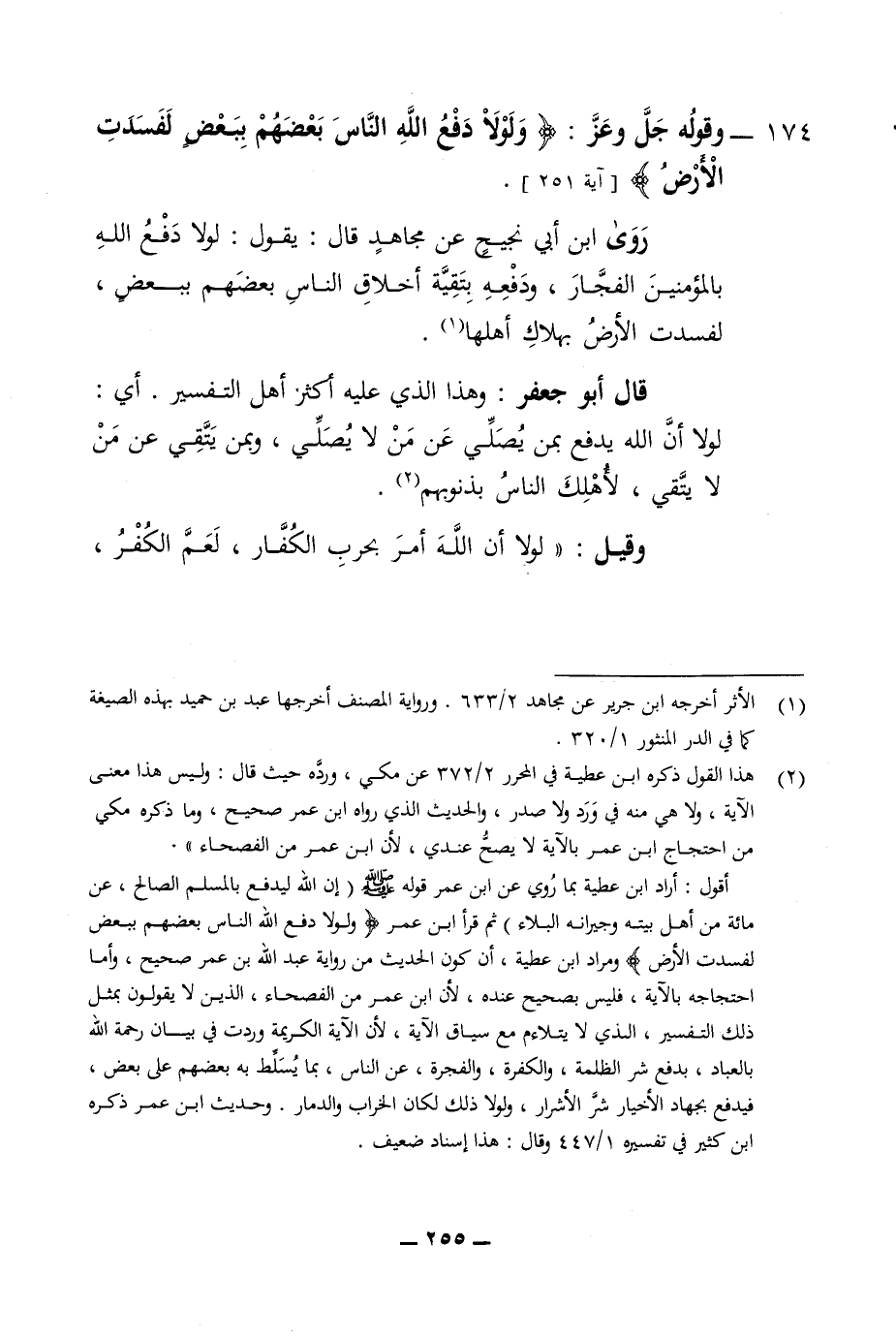 174 - وقوله جل وعز ولولا دفع الله الناس بعضهم ببعض لفسدت الارض روى ابن أبي نجيج عن مجاهد قال يقول لولا دفع الله بالمؤمنين الفجار ودفعه بتقية أخلاق الناس بعضهم ببعض لفسدت الارض بهلاك اهلها قال أبو جعفر وهذا الذي عليه أكثر أهل التفسير أي لولا ان الله يدفع بمن يصلي عن من لا يصلي وبمن يتقي عن من لا يتقي لاهلك الناس بذنوبهم وقيل لولا أن الله أمر بحرب الكفار لعم الكفر