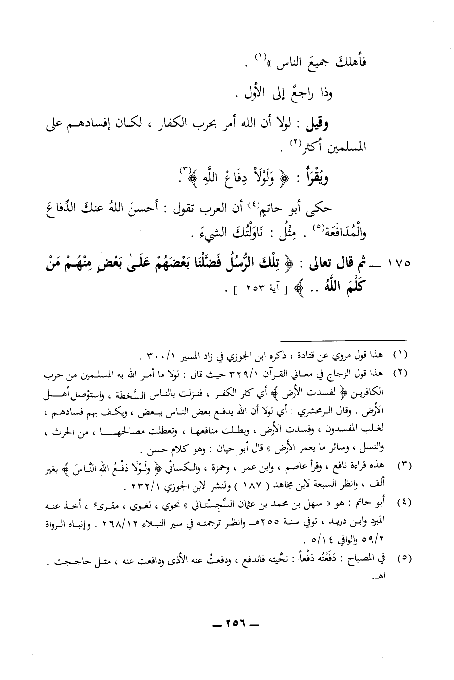 حكى أبو حاتم أن العرب تقول أحسن الله عنك الدفاع والمدافعة مثل ناولتك الشئ 175 - ثم قال تعالى تلك الرسل فضلنا بعضهم على بعض منهم من كلم الله