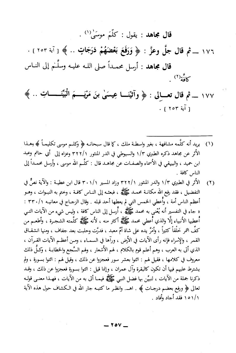 قال مجاهد يقول كلم موسى 176 - ثم قال جل وعز ورفع بعضهم درجات قال مجاهد أرسل محمدا صلى الله عليه وسلم الى الناس كافة 177 - ثم قال تعالى وآتينا عيسى ابن مريم اليبنات