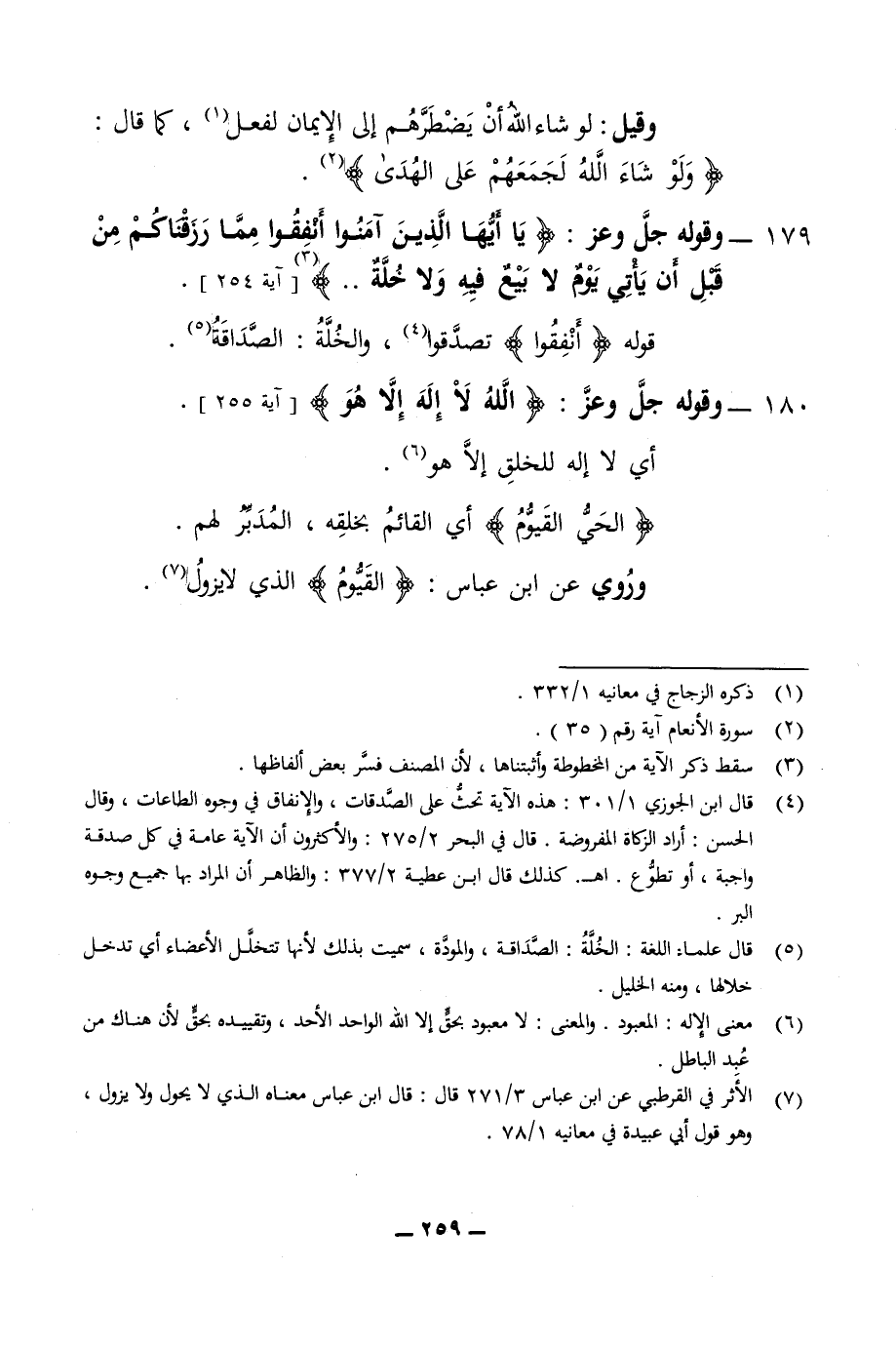 179 - وقوله جل وعز يا آيها الذين آمنوا انفقوا مما رزقناكم من قبل ان ياتي يوم لا بيع فيه ولا خلة قوله انفقوا تصدقوا والخلة الصداقة 180 - وقوله جل وعز الله لا اله الا هو أي لا اله للخلق الا هو الحي القيوم أي القائم بخلقه المدبر لهم وروي عن ابن عباس القيوم الذي لا يزول