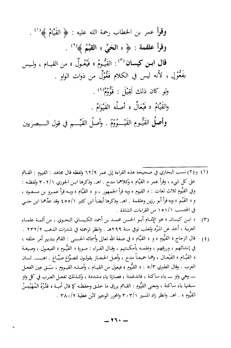 وقرأ عمر بن الخطاب رحمة الله عليه القيام وقرأ علقمة الحي القيم قال ابن كيسان القيوم فيعول من القيام وليس بفعول لانه ليس في الكلام فعول من ذوات الواو ولو كان ذلك لقيل قووم والقيام فيعال اصله القيوام وأصل القيوم القيووم واصل القيم في قول البصرين
