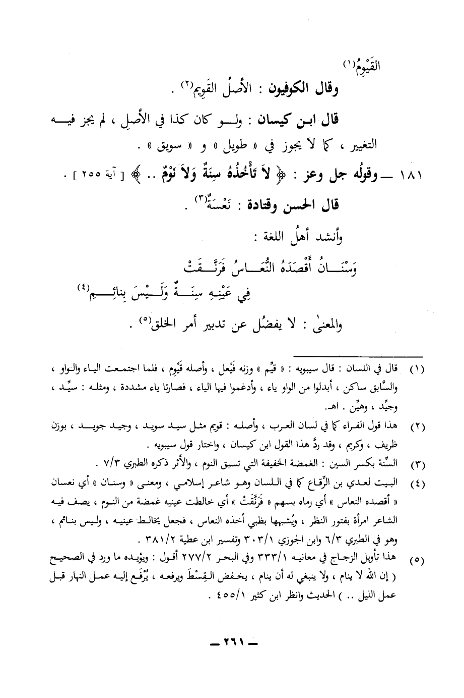 القيوم وقال الكوفيون الاصل القويم قال ابن كيسان ولو كان كذا في الاصل لم يجز فيه التغير كما لا يجوز في طويل وسويق 181 - وقوله جل وعز لا تأخذه سنة ولا نوم قال الحسن وقتادة نعسة