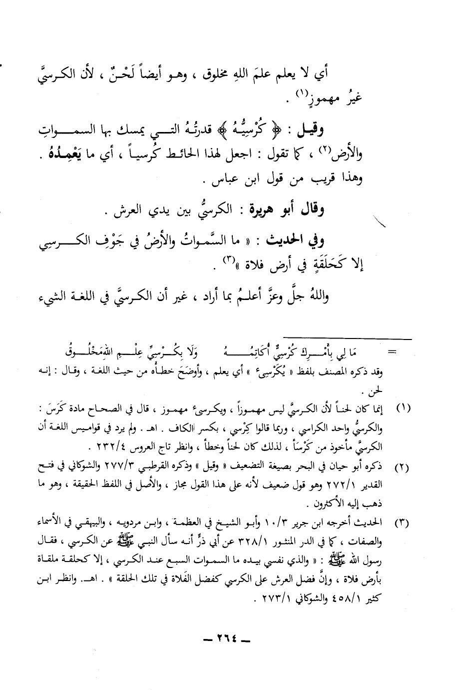 أي لا يعلم علم الله مخلوق وهو ايضا لحن لان الكرسي غير مهمور ولم وقيل كرسيه قدرته التي يمسك بها السموات والارض كما تقول اجعل لهذا الحائط كرسيا أي ما يعمده وهذا قريب من قول ابن عباس وقال أبو هريرة الكرسي بين يدي العرش وفي الحديث ما السموات والارض في جوف الكرسي الا كحلقة في ارض فلاة والله جل وعز أعلم بما اراد غير ان الكرسي في اللغة الشئ