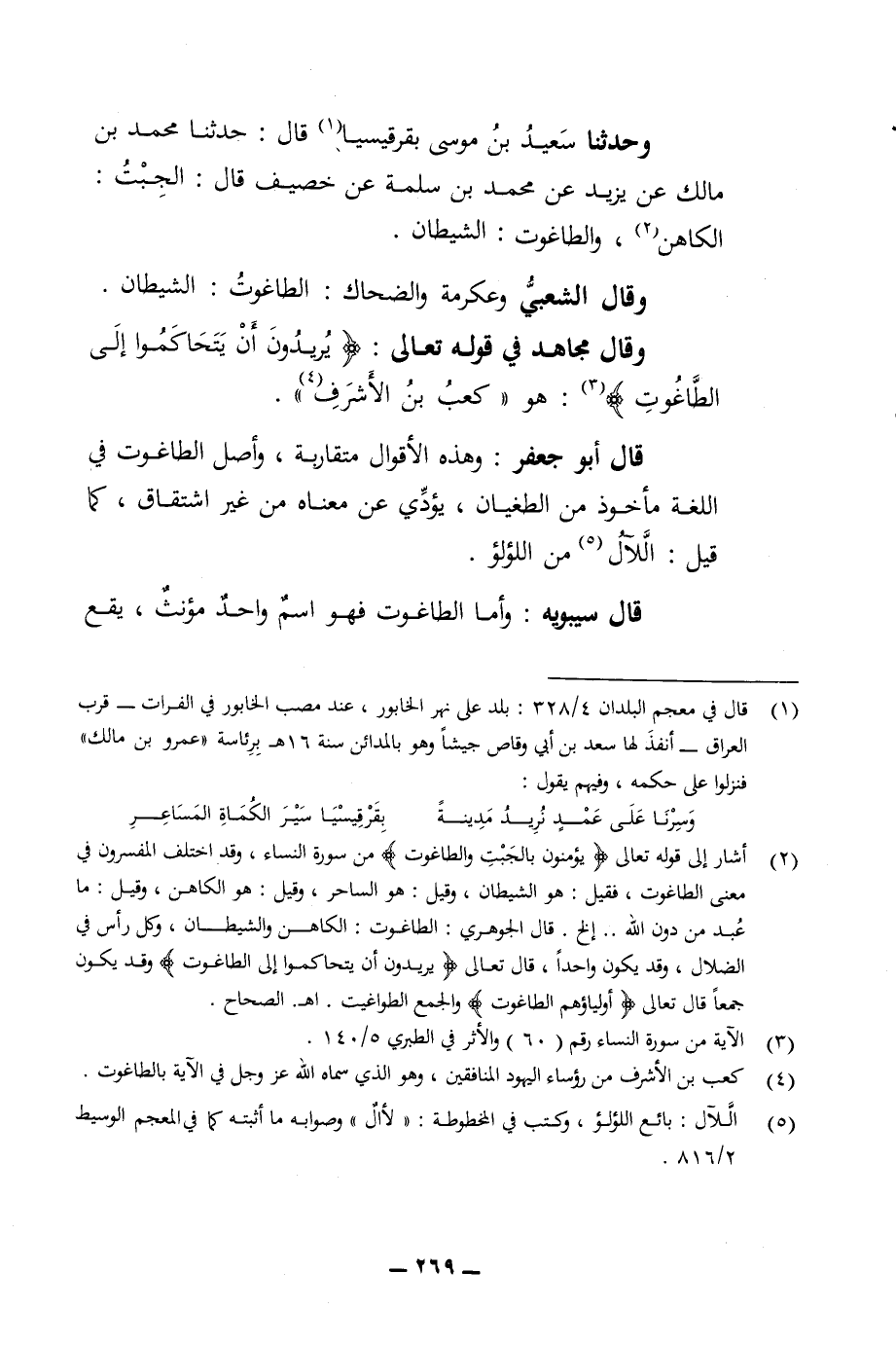 وحدثنا سعيد بن موسى بقرقيسيا قال حدثنا محمد بن مالك عن يزيد عن يزيد عن محمد بن سلمة عن خصيف قال الجبت الكاهن والطاغوت الشيطان وقال الشعبي وعكرمة والضحاك الطاغوت الشيطان وقال مجاهد في قوله تعالى يريدون ان يتحاكموا الى الطاغوت هو كعب بن الاشرف قال أبو حعفر وهذه الاقوال متقاربة وأصل الطاغوت في اللغة مأخوذ من الطغيان يؤدي عن معناه من غير اشتقاق كما قيل اللآل من اللؤلؤ قال سيبويه وأما الطاغوت فهو اسم واحد مؤنث يقع