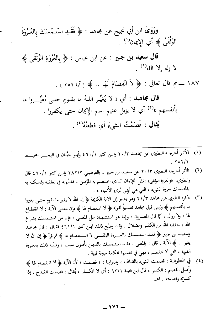 قال سعيد بن جبير عن ابن عباس بالعروة الوثقى لا اله الا الله 187 - ثم قال تعالى لا انفصام لها قال مجاهد أي لا يغير الله ما بقوم حتى يغيروا ما بأنفسهم أي لا يزيل عنهم اسم الايمان حتى يكفروا يقال فصمت الشئ أي قطعته