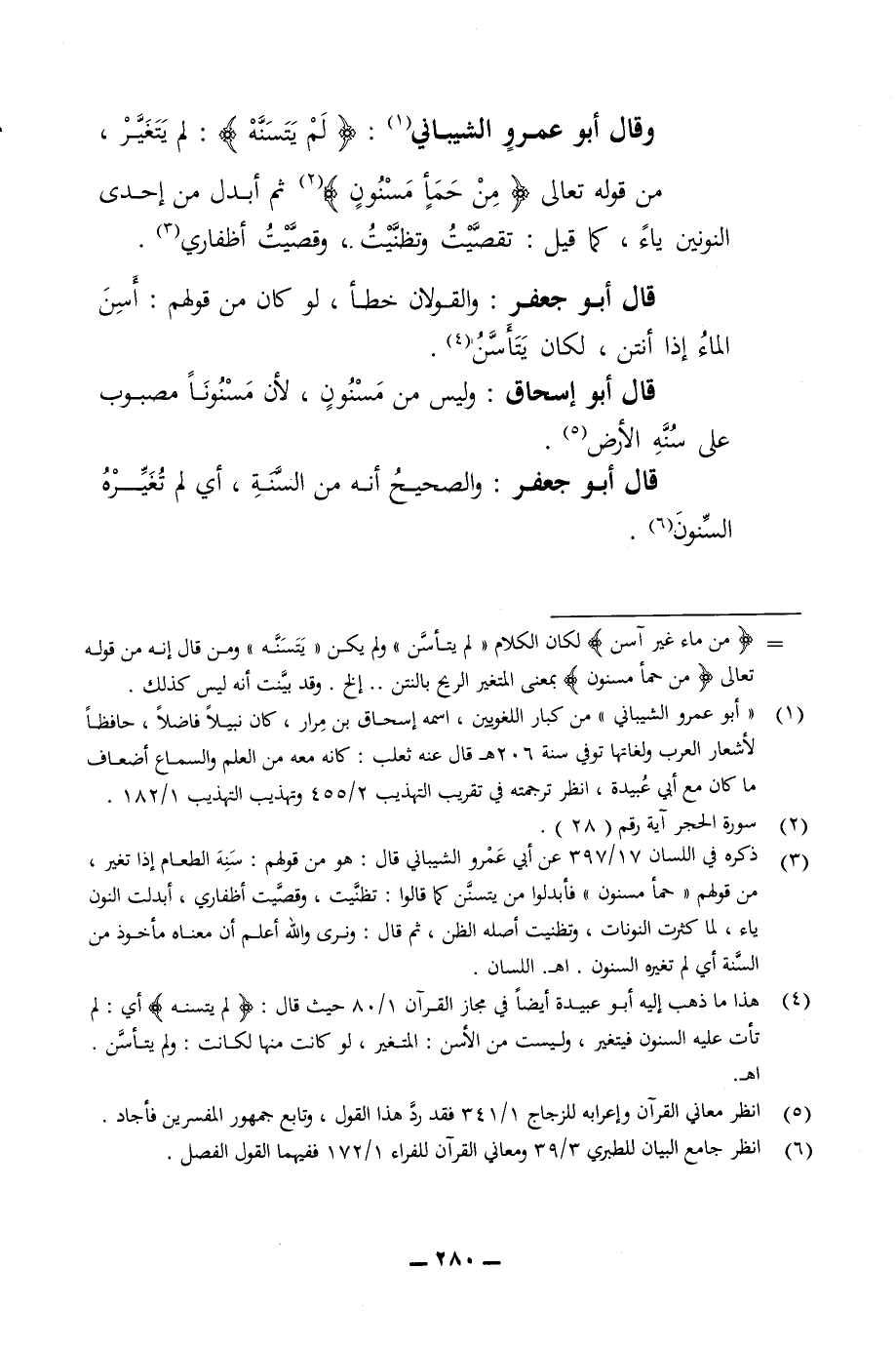 وقال أبو عمر الشيباني لم يتسنه لم يتغير من قوله تعالى من حمأ مسنون ثم أبدل من احدى النونين ياء كما قيل تقصيت وتظنيت وقصيت اظافري بين قال أبو جعفر والقولان خطأ لو كان من قولهم أسن الماء إذا انتن لكان يتأسن قال أبو اسحاق وليس مسنون لان مسنونا مصبوب