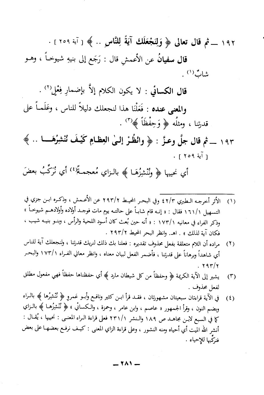 192 - ثم قال تعالى ولنجعلك آية للناس قال سفيان عن الاعمش قال رجع الى بنيه شيوخا وهو شاب قال الكسائي لا يكون الملام الا باضمار فعل والمعنى عنده فعلنا هذا لنجعلك دليلا للناس وعلما على قدرتنا ومثله وحفظا 193 - ثم قال جل وعز وانظر الى العظام كيف ننشرها أي نحييها وننشرها بالزاي معجمة أي نركب بعض
