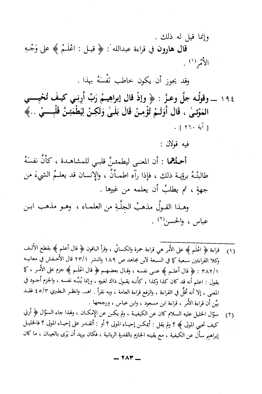 قال هارون في قراءة عبد الله قيل اعلم على وجه الامر وقد يجوز ان يكون خاطب نفسه بهذا 194 - وقوله عز وجل واذ قال ابراهيم رب أرني كيف تحي الموتى قال أولم تؤمن قال بلى ولكن ليطمئن قلبي فيه قولان أحدهما ان المعنى ليطمأن أهل قلبي للمشاهدة كأن نفسه طالبته برؤية ذلك فإذا رآه اطمان والانسان قد يعلم الشئ من جهة ثم يطلب أن يعلمه من غيرها وهذا القول مذهب الجلة من العلماء وهو مذهب ابن عباس والحسن