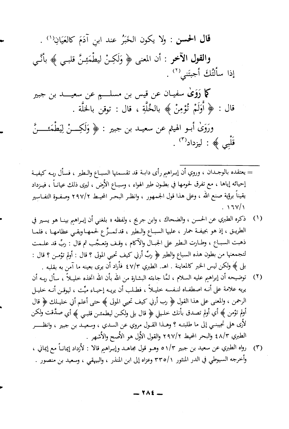 قال الحسن ولا يكون الخبر عند ابن آدم كالعيان والقول الاخر ان المعنى ولكن ليطمئن قلبي بأني إذا سألتك أجبتني كما روى عن سفيان عن قيس بن مسلم عن سعيد بن جبير قال أولم تؤمن بالخلة قال توقن بالخلة وروى أبو الهيثم عن سعيد بن جبير ولكن ليطمئن قلبي ليزداد